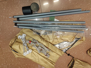 容纳人数:4个人 便携性能:还可以 适用场景:休闲坐一下 还可以,挺喜欢,第一次搭要慢一点,后面学会了就好了,不用抵着晒太阳了。 钉子再长一点就好了
