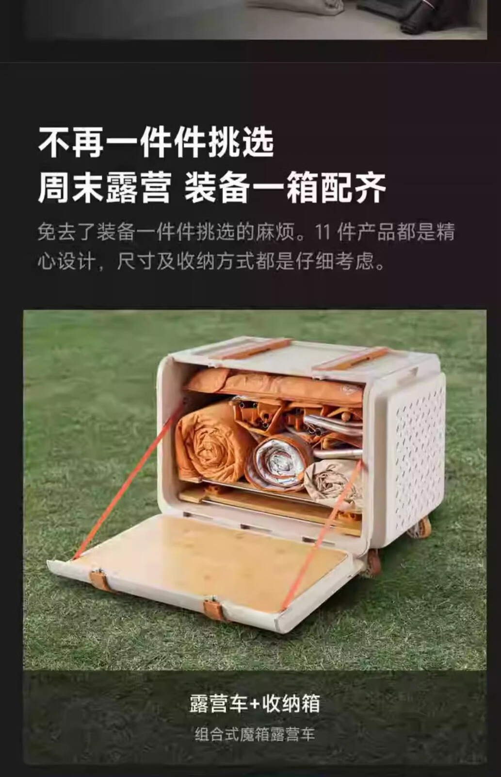 关注了很久,虽然北京过了露营的季节,但还是趁着活动入手了魔箱,感觉这11件都收纳在一起很神奇。喜欢这种整齐的风格,摆在家里当个小茶几还真挺好看。期待着北京的春天!