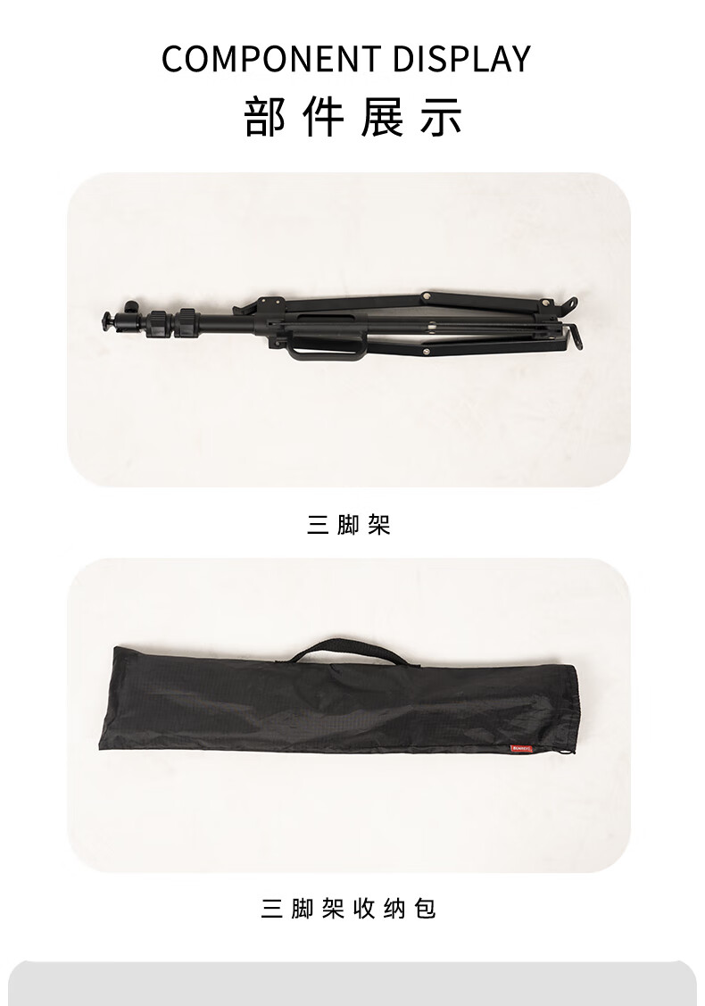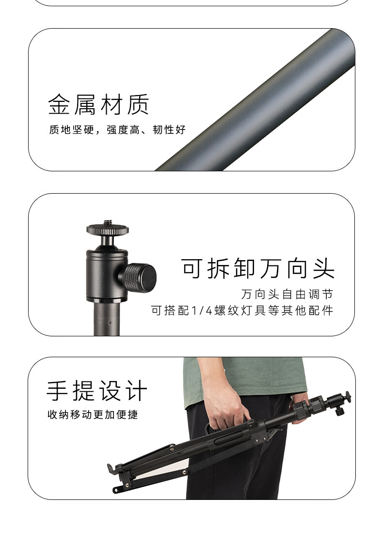 是理想中的产品💖,质量不错,很有质感,有点重量,所以很稳,还可以用来当相机三脚架,装上灯后照明高度比较合适,物流也很快~