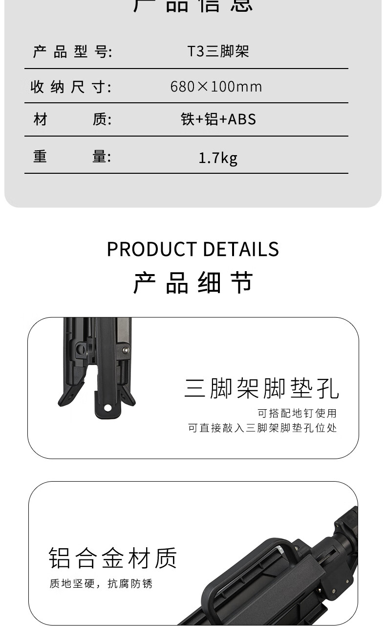 T1支架在同事的推荐下购买,质量杠杠的,没有失望,主要部件全部是铝合金的,到是希望有些铁的材质便于用磁铁吸住灯。