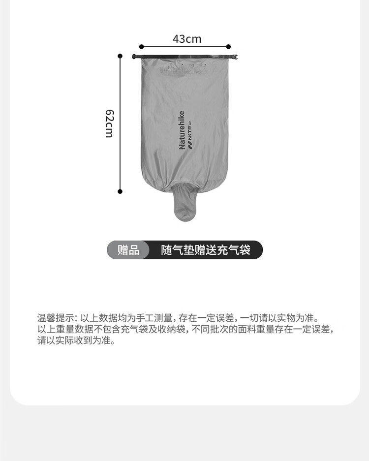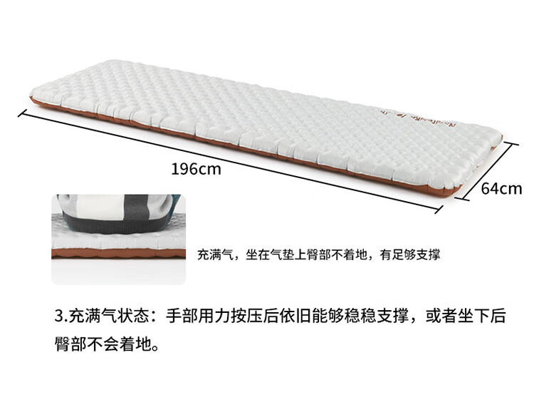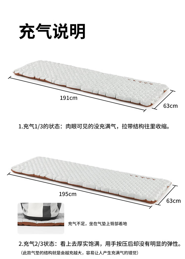 收纳起来挺小巧,保暖效果也挺好。微微漏气很缓慢,用个两天不影响。充气袋打气五六次,坐在上面不沾地。用手去按能触底,躺在上面没问题。