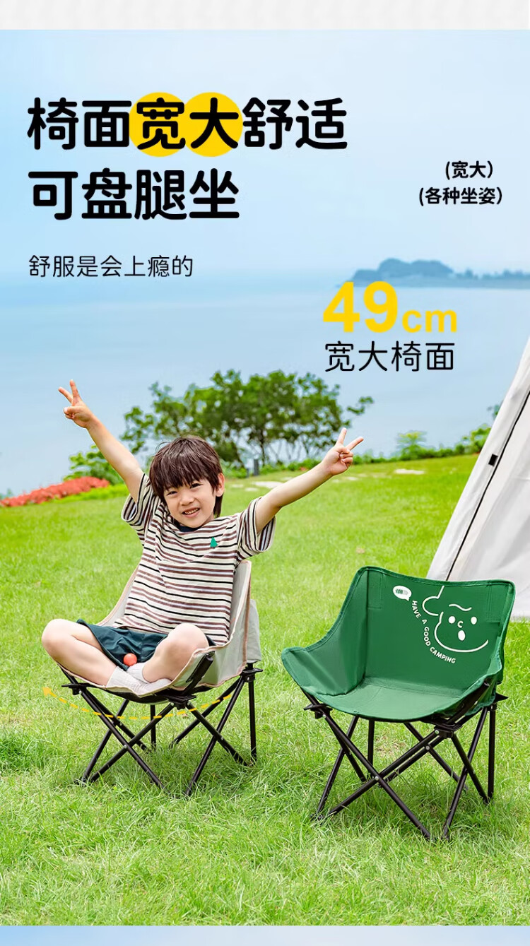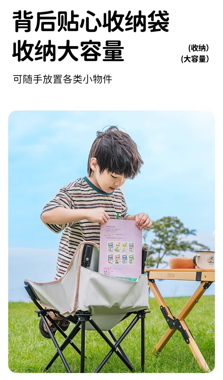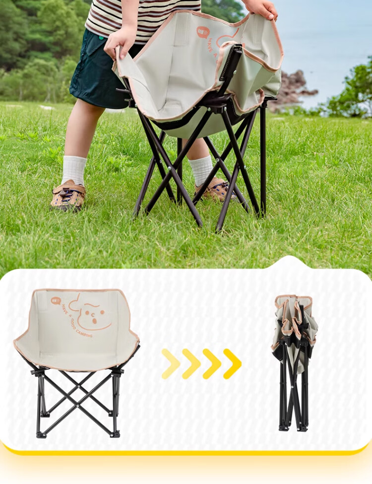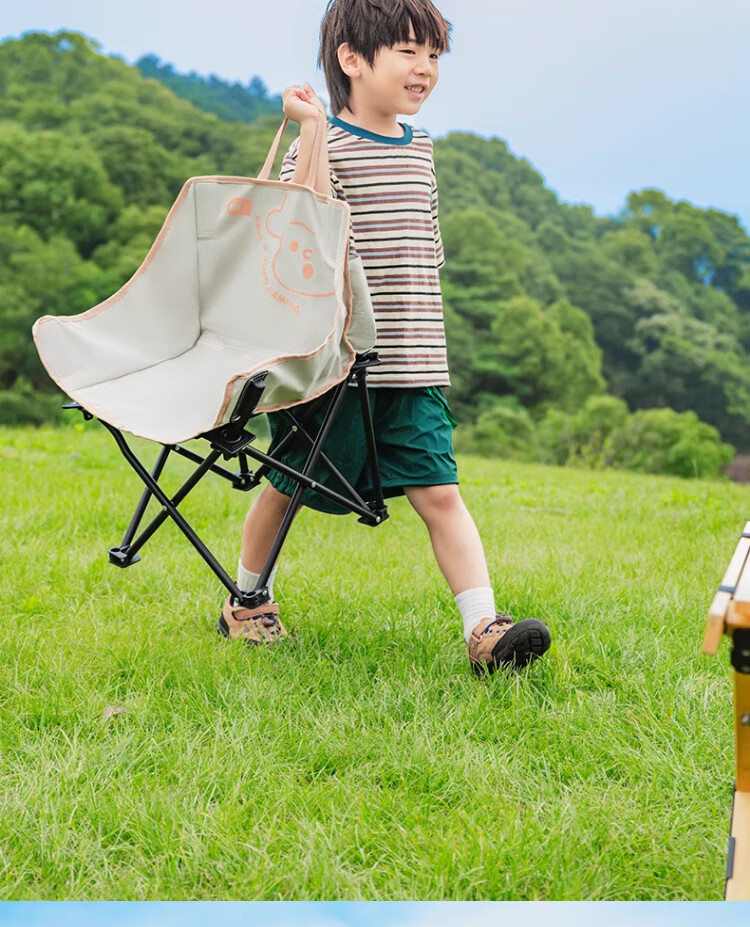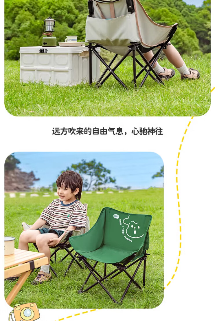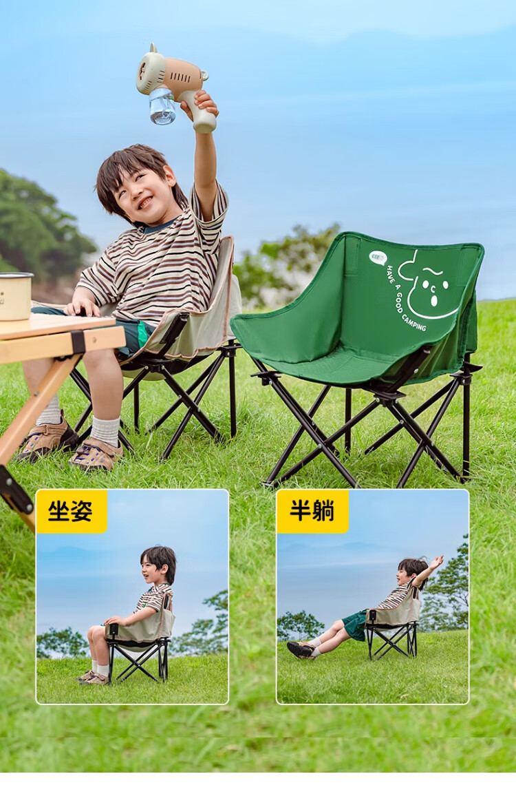 去年买了两条大人的折叠椅,没有考虑到孩子会需要,想着他应该也坐不住。没想到今年出去搭帐篷,他也要坐椅子,所以给他也安排一个儿童折叠椅。
