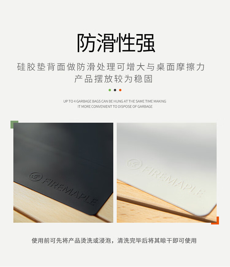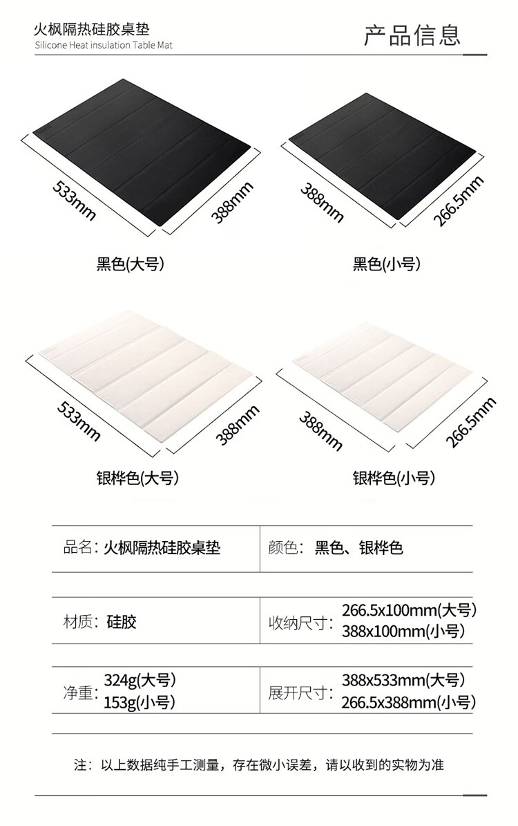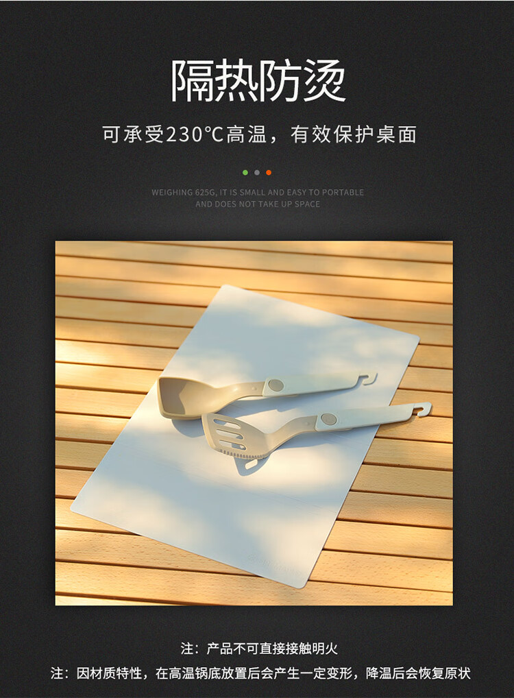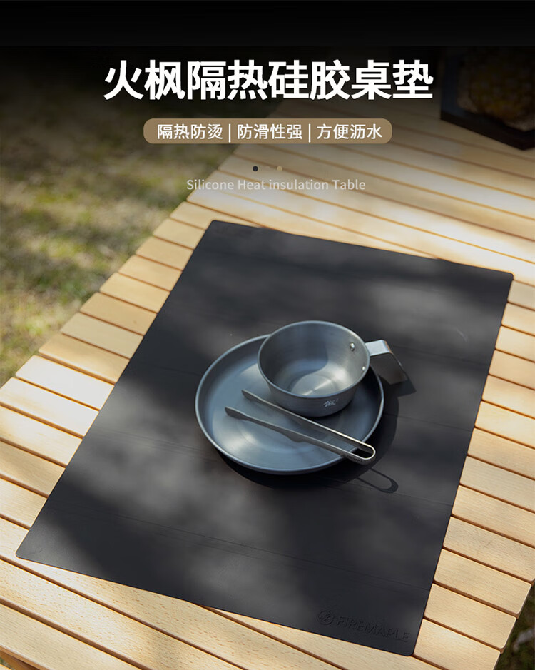 户外不少装备,是火枫(FIRE-MAPLE)的,特别是用火方面,但他家其他产品作得也不错,这款隔热硅胶桌垫多年前,用过黑色小号,这次出了这款颜色,也很喜欢,能折叠,方便携带,值得推荐购买。