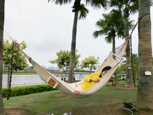 今天刚刚试用了一下,安装起来很简单,收纳起来也很方便,吊起来非常稳当,躺在上面非常舒服,也非常安全,不侧翻,承重能力也不错