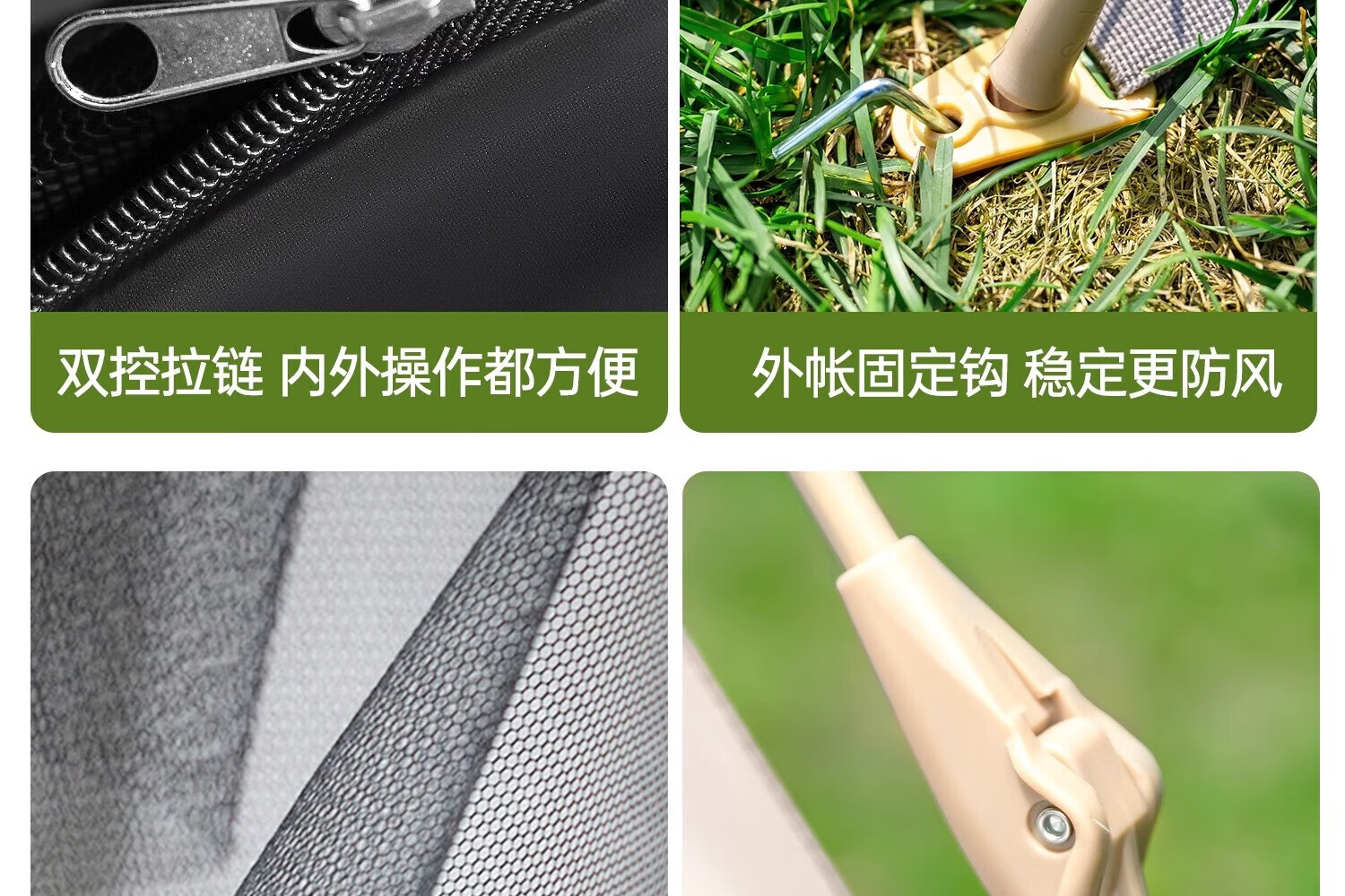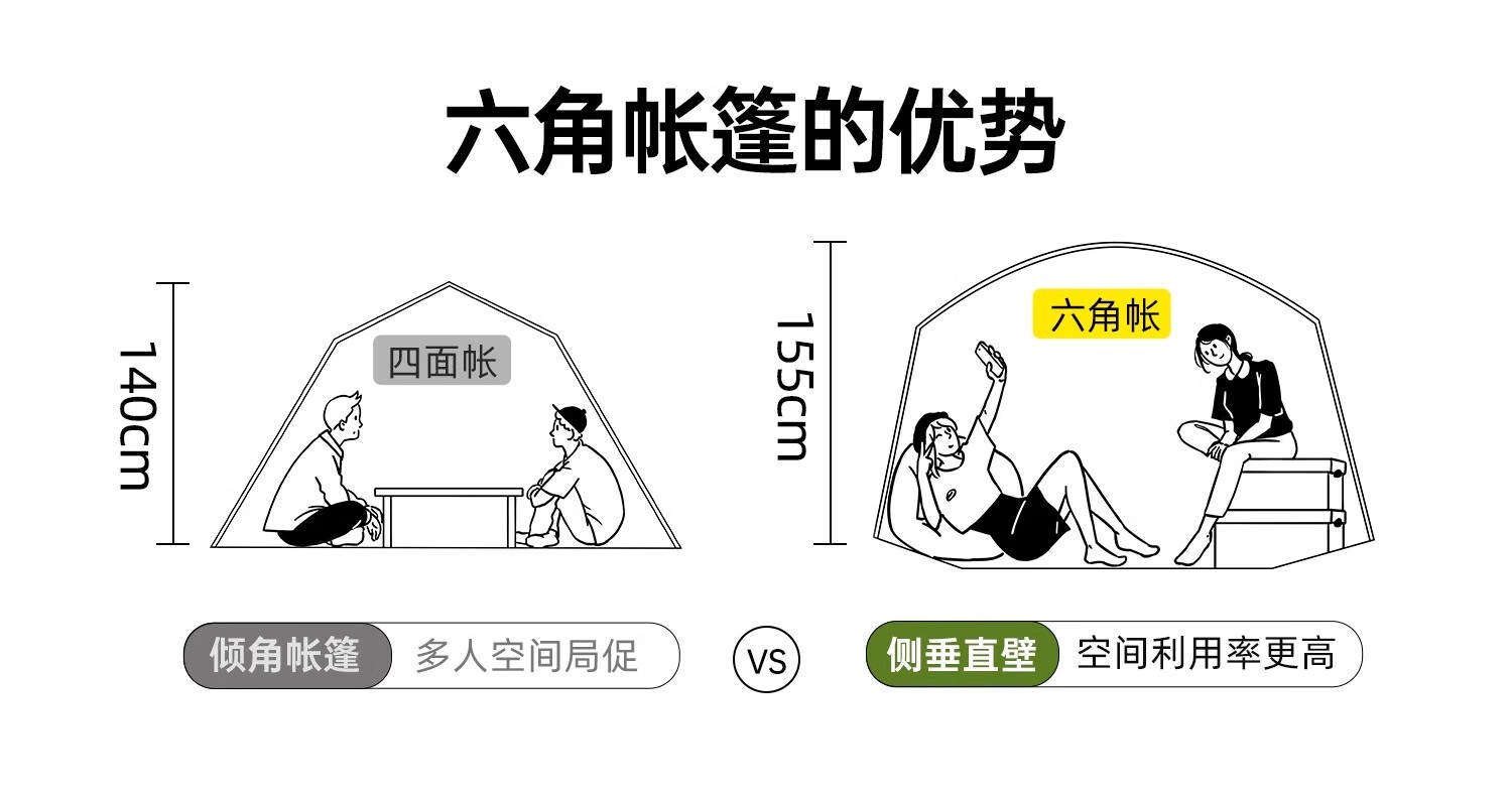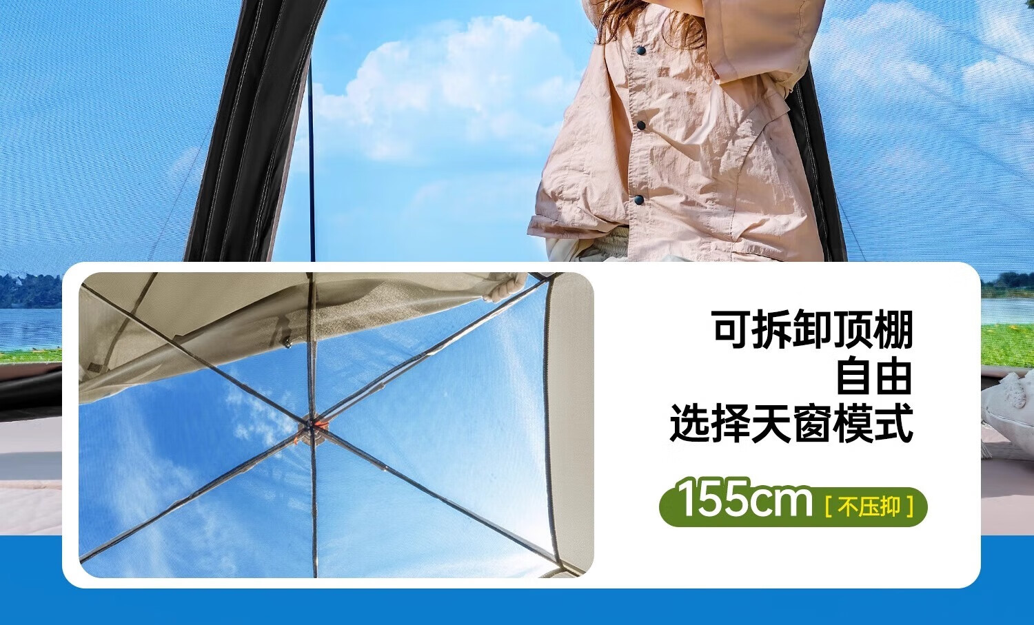 通风效果良好,多为双门双窗设计,开门内层带有透气防蚊网纱,有的还配备双侧对流窗+顶部透气网。防晒性能较好,外帐多采用银胶涂层等,紫外线阻隔率高。防雨性能也不错,采用多涂层拒水工艺的210T加厚防雨布等,防水指数较高。
