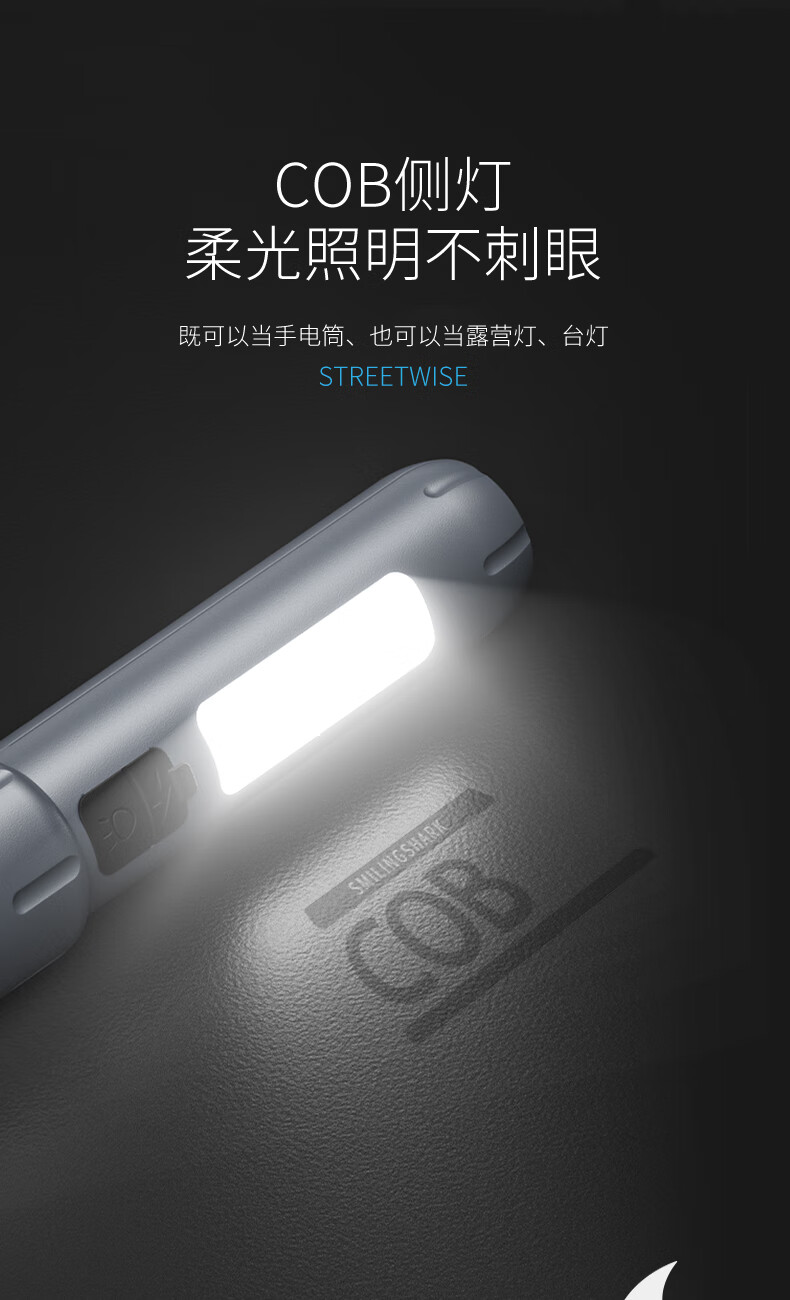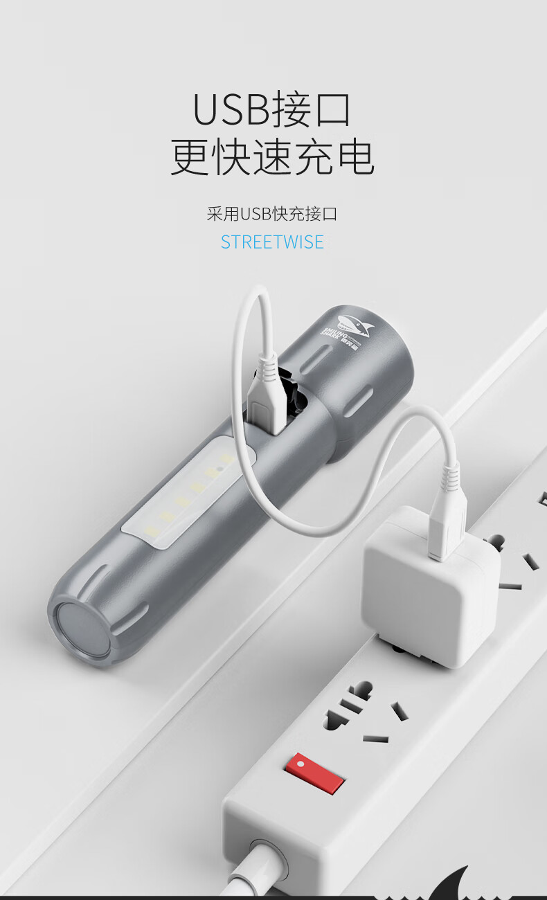 手电筒外观很好,亮度非常亮,还有侧灯的,还有挂钩,用配送充电数据线,性价比真的超高了