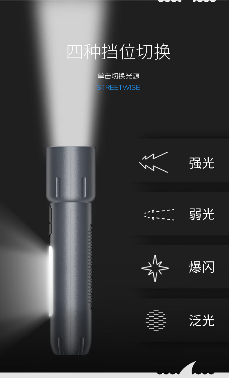 小巧方便携带,不占地方,易操作,晚上下班有一段路黑,没有灯,这个很好用,方便携带,还能充电,不要考虑买电池的事,续航也很nice。