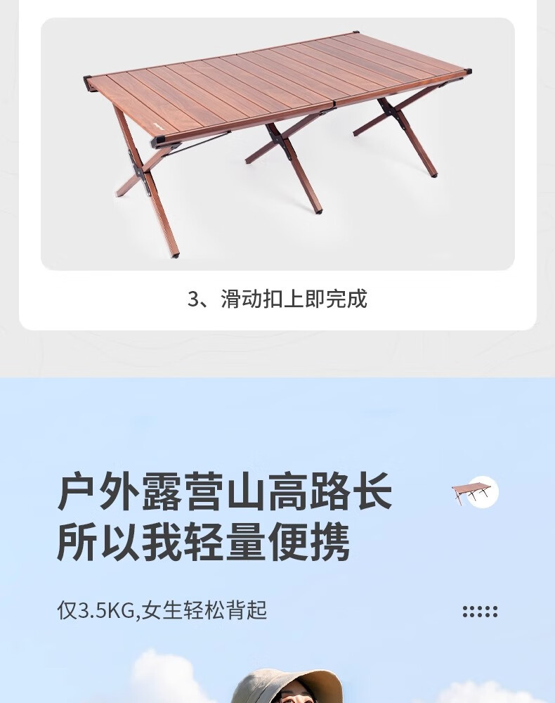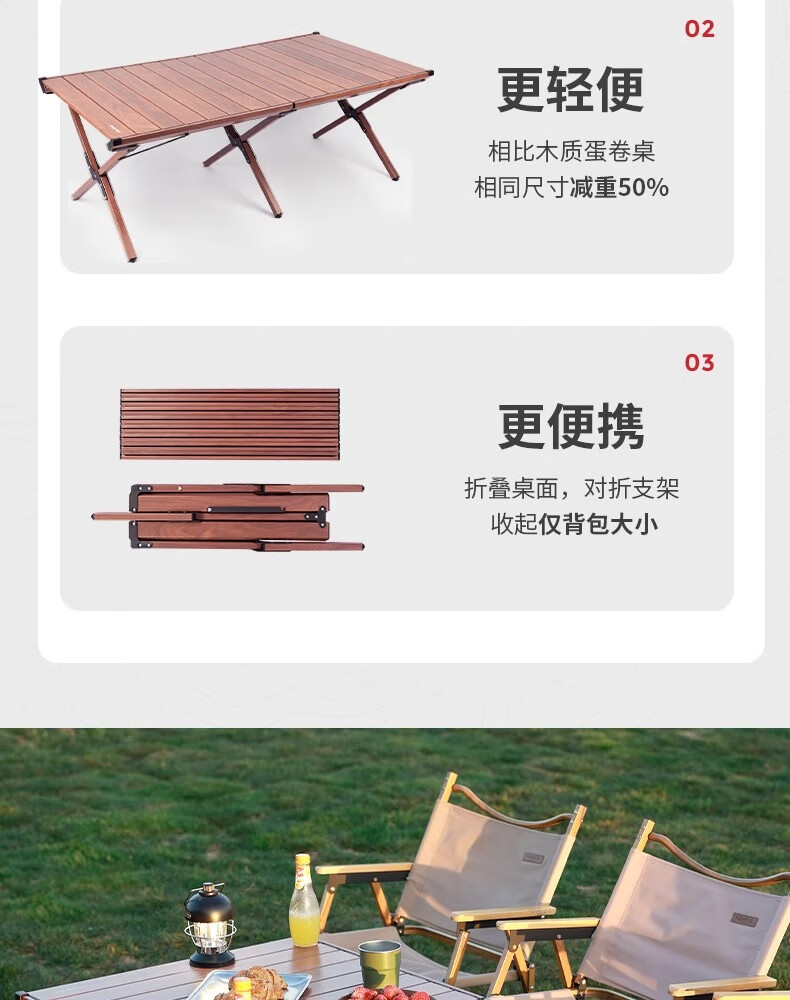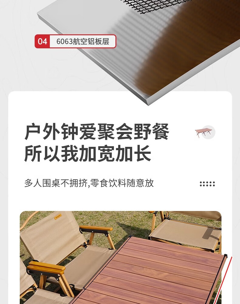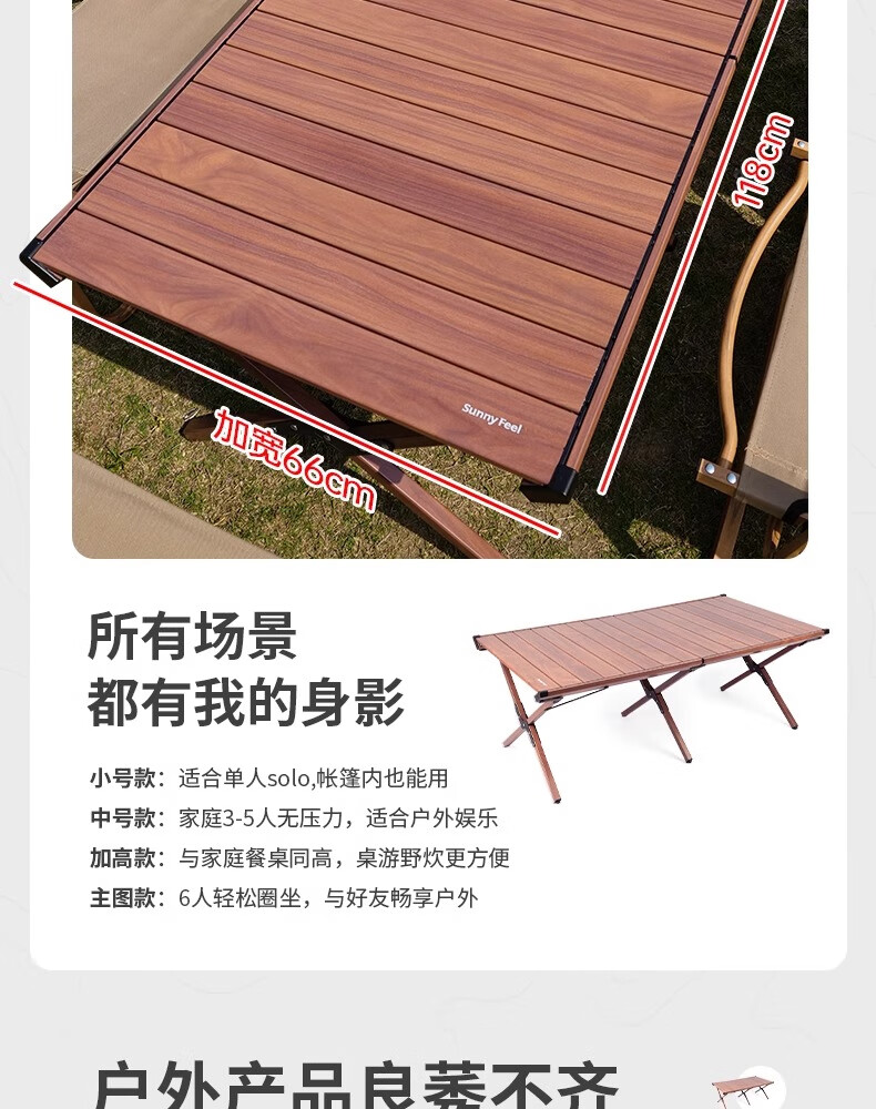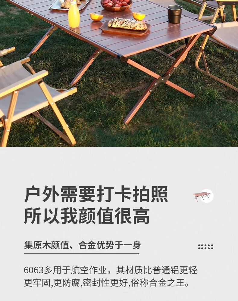 这个桌子我很喜欢,铝合金的不怕风吹雨晒的。而且桌面没有大缝隙,出去露营打牌也很好,朋友看到我买了,也回购了!希望以后多点优惠活动!