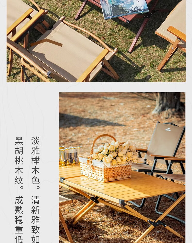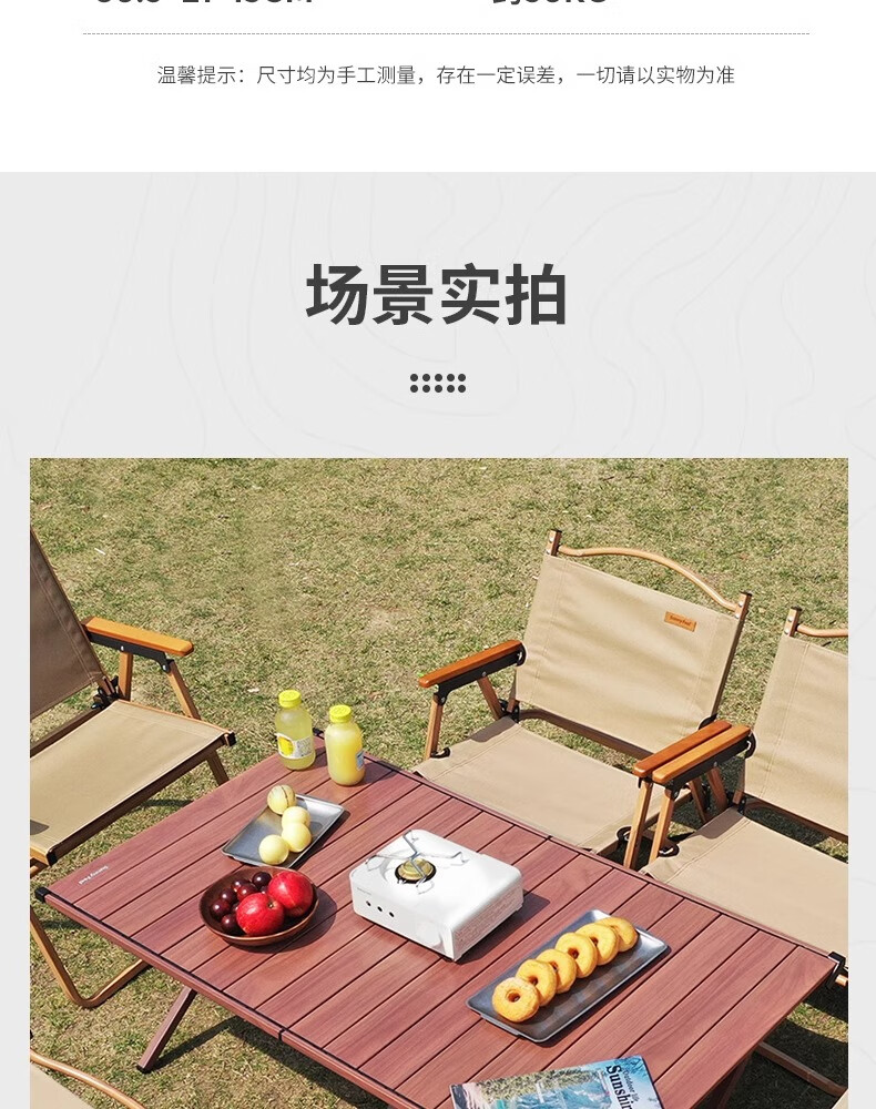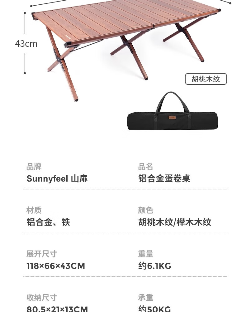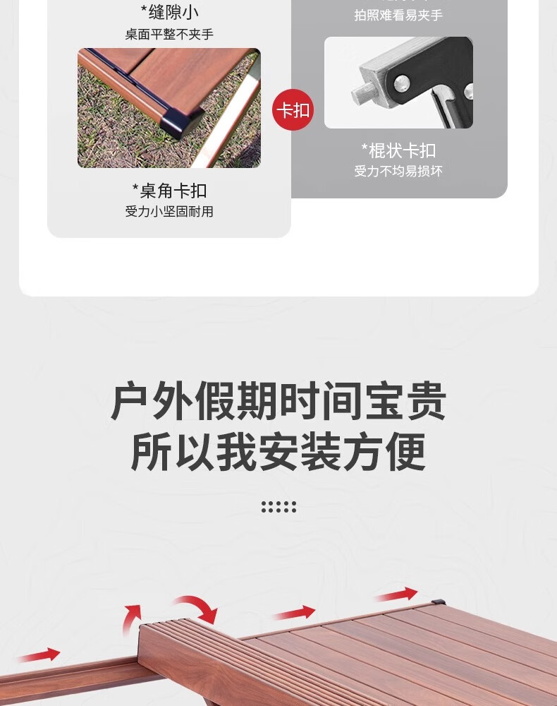 这款产品的材质没得说,黑桃木的颜色很漂亮,五金件的细节也不错,整理非常轻便,桌面尺寸非常满意,长宽都非常够用,这个季节安排露营刚好用上来
