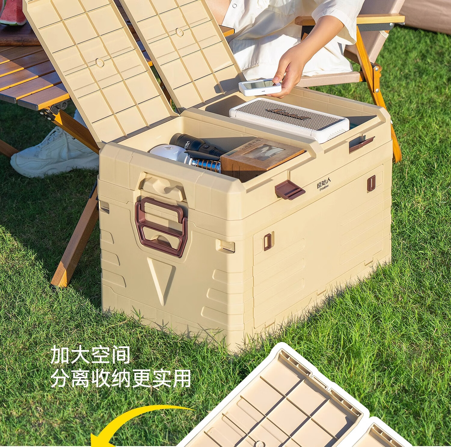 原始人户外收纳箱露营折叠箱储物箱子车载整理野营用品便携式折叠桌 55L米白色【可侧开 送木质桌板】