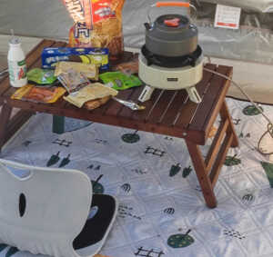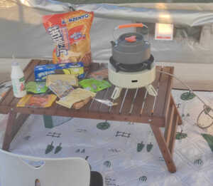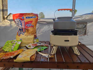 这搞点零食烧点茶太爽了,这个炉子烧水还挺快的了,这壶水两分钟就烧好了,我还不是开的最大火
