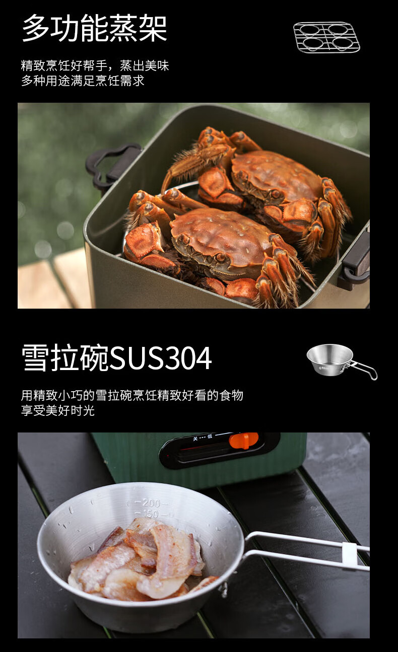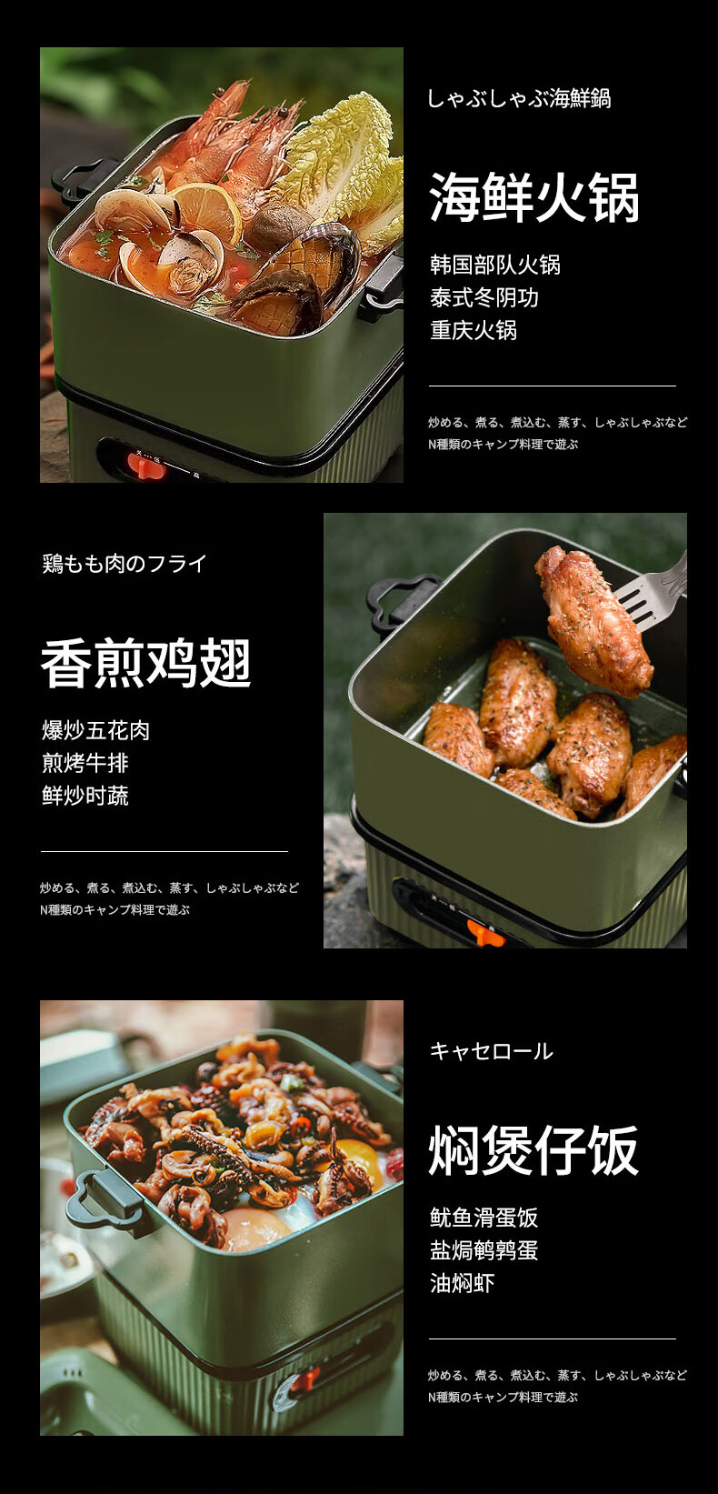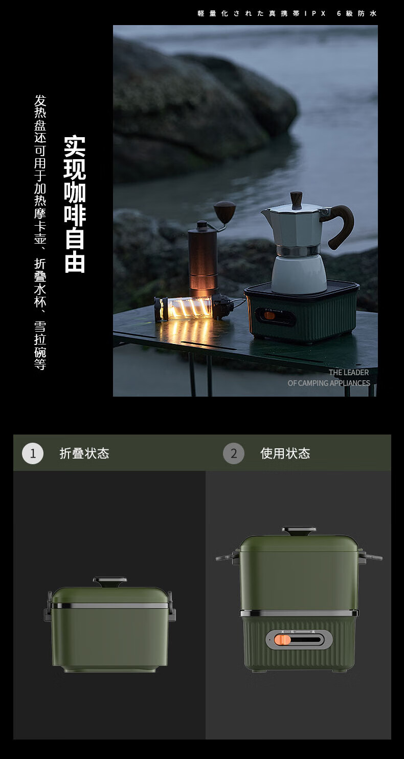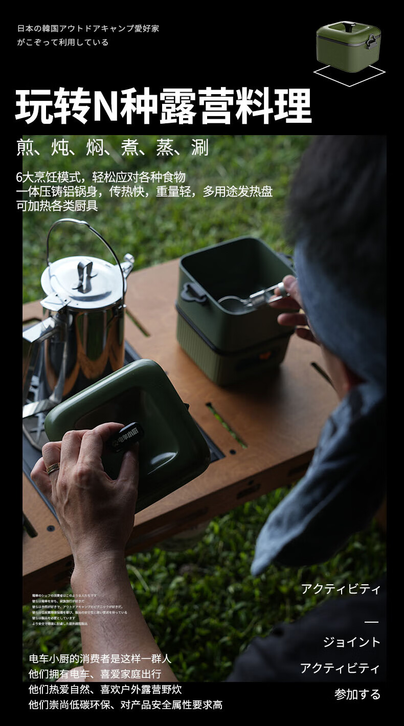电车小厨露营料理锅套装户外炉具便携式小型野外电煮锅550w功率 橄榄绿10件套