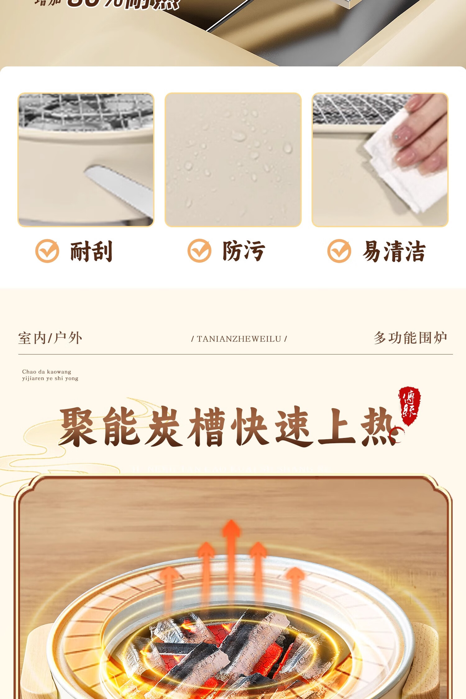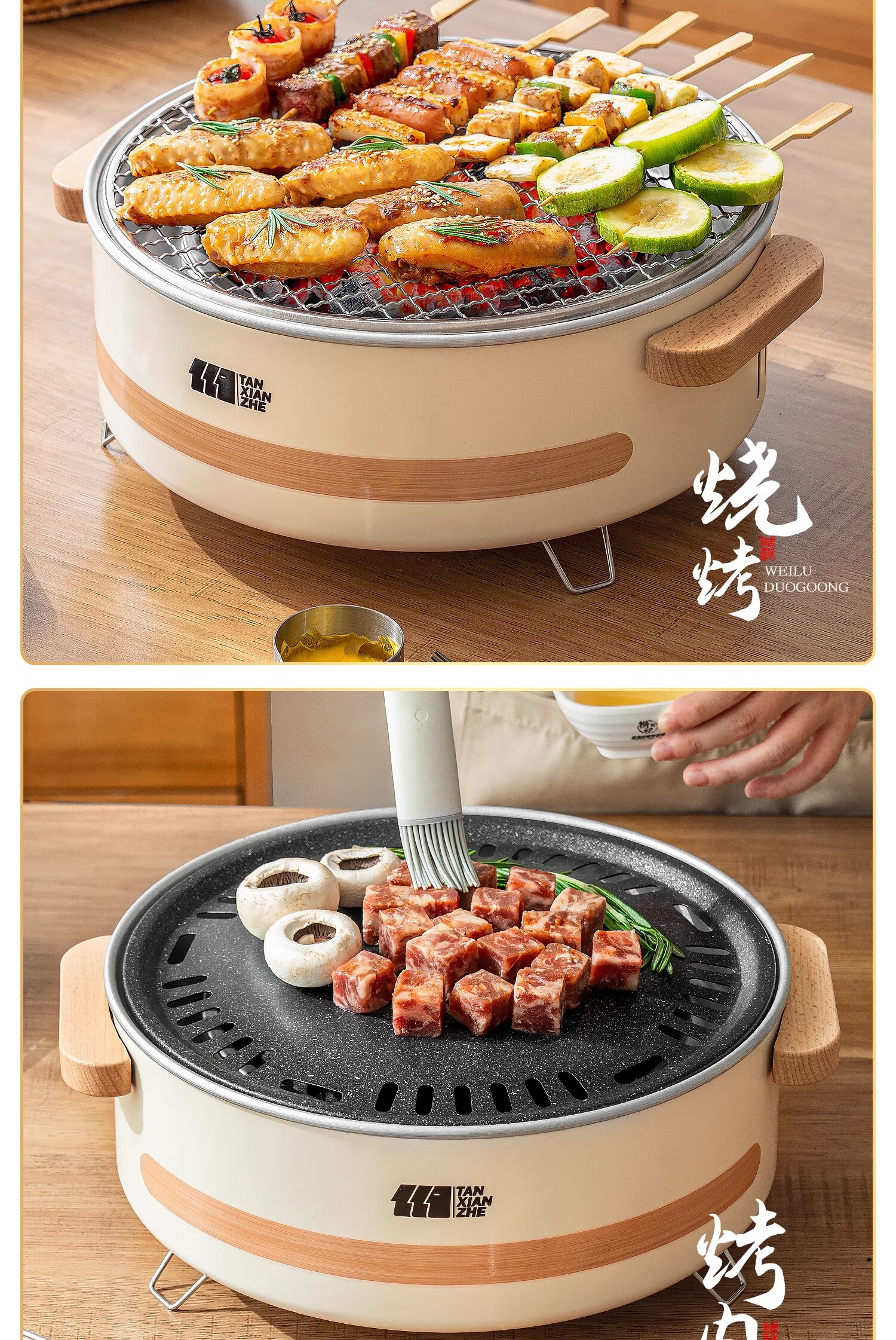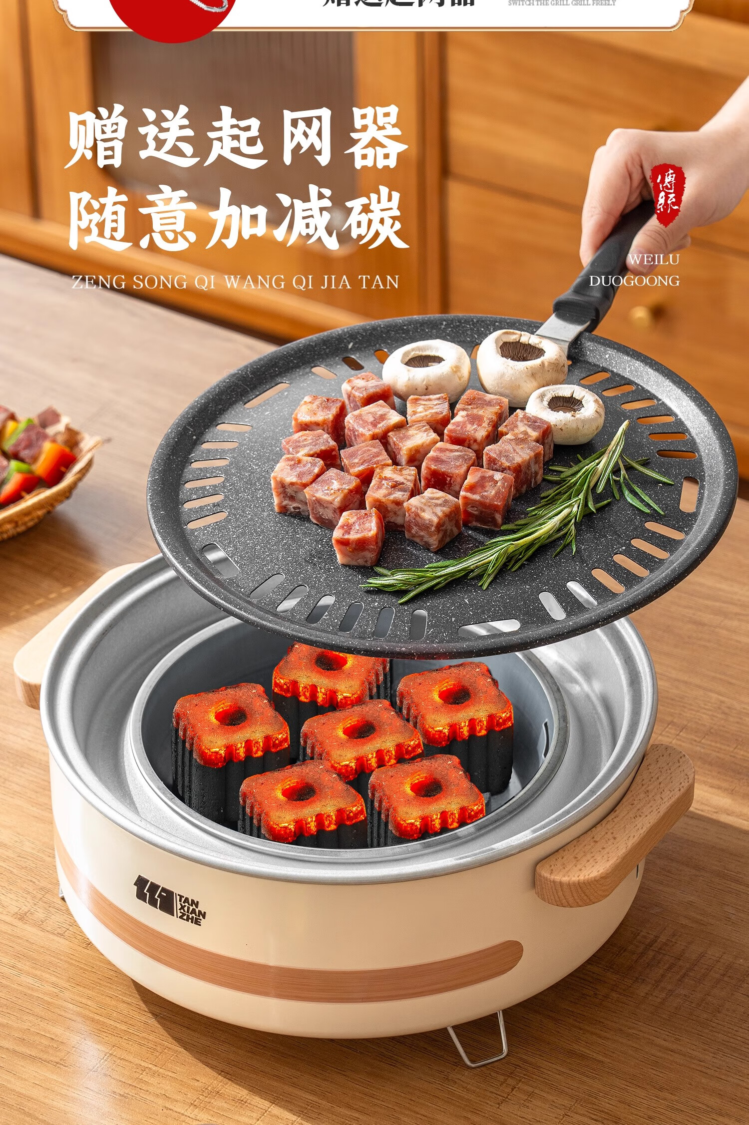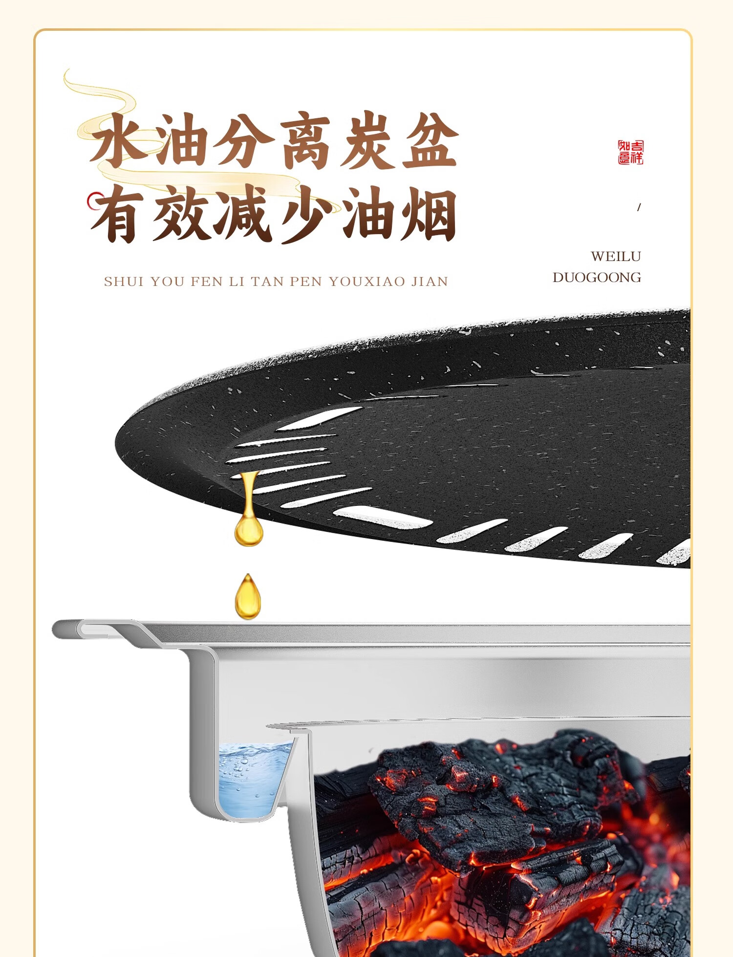 设计挺好的,旁边要加水起到一个隔热的作用,把手是防烫的,可以提起来,放烤网就可以开烤了