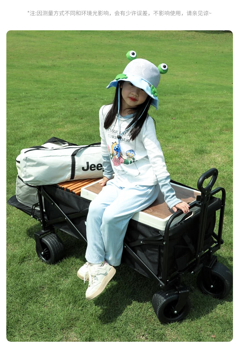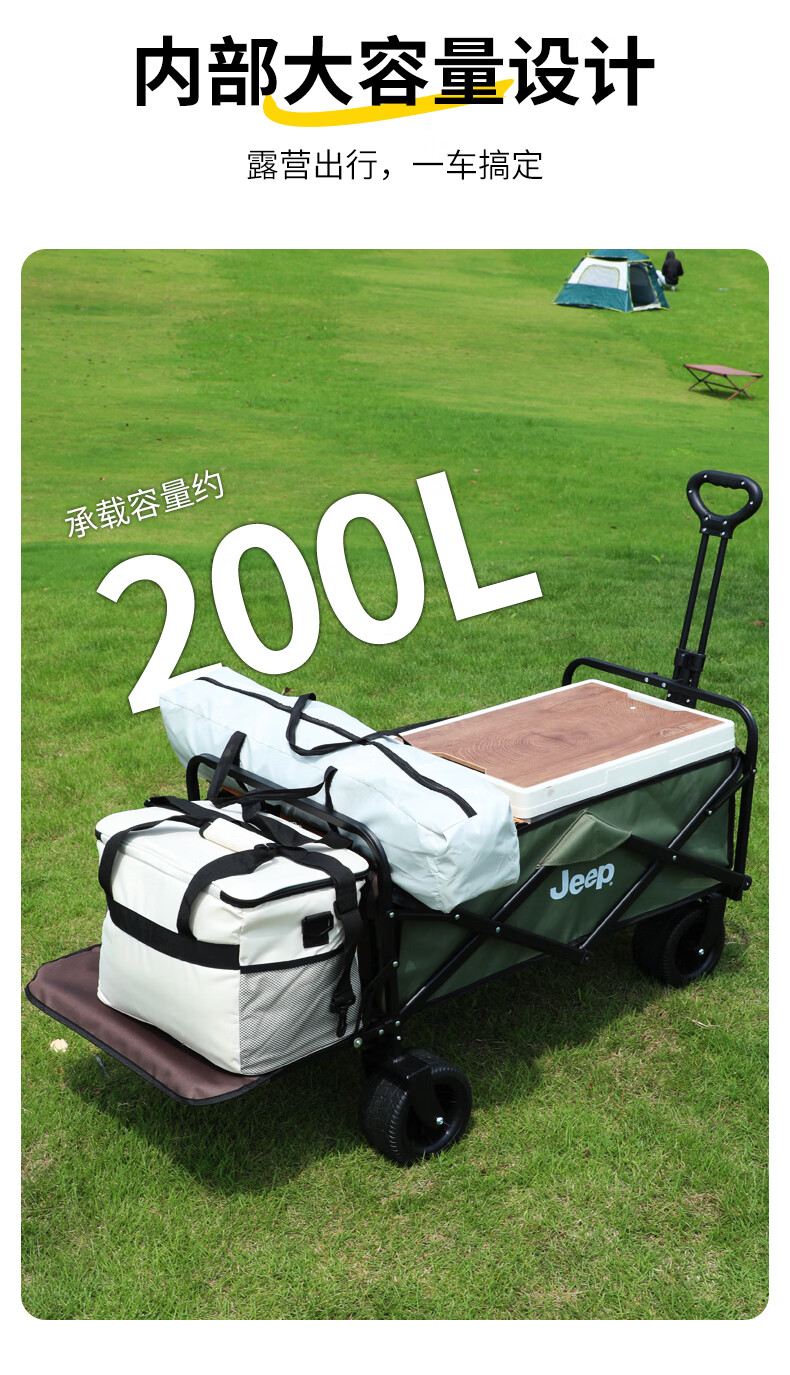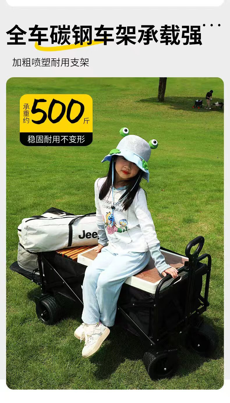 JEEP吉普露营车户外可折叠手推野餐营地超大拖车拉杆摆摊小推车 黑色+黑色桌板+推把 500L 有刹车