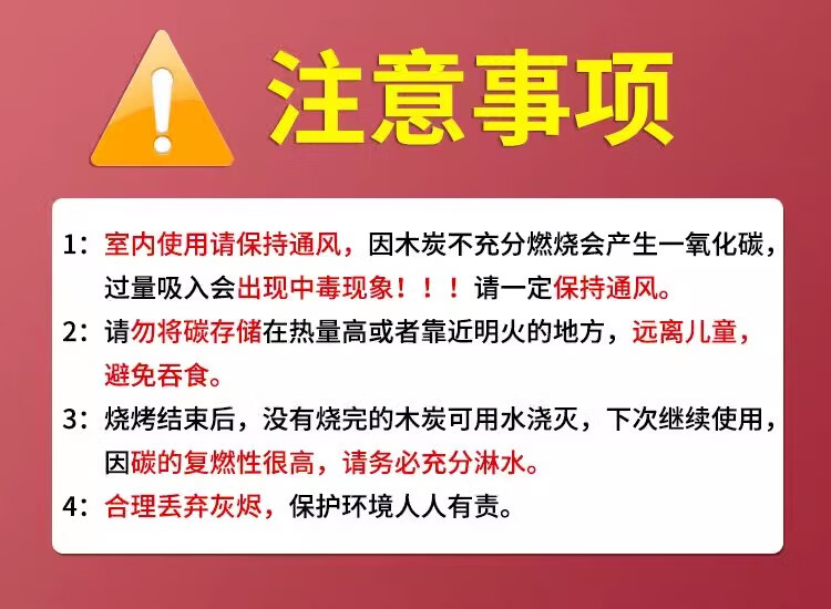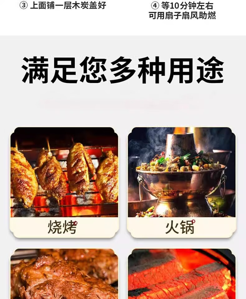 必须给个好评!商家太有良心了绝对的真材实料!木炭都是实心的,燃烧起来没有木炭的味道,感觉像是煤块,现在煤这么贵应该不会这么不计成本吧,另外商家还送了一个酒精块,也不知道是我不会用还是怎么的,酒精块烧完了愣是没点着,最后还是在燃气灶上面烧了十分钟,一块一块的烧,整个点火过程经历了一个小时,最后大家都没啥胃口了,食材都节省了,感谢商家!