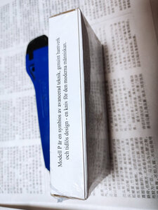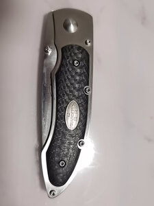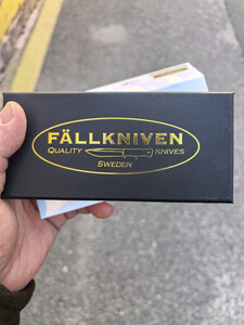 fallkniven系列,买了几把,都很喜欢。这款小刀,半年前买的沙漠铁木柄的,这次买的碳纤维柄。包装盒的标识略有变化,碳纤维柄两面都有“皇冠”标。