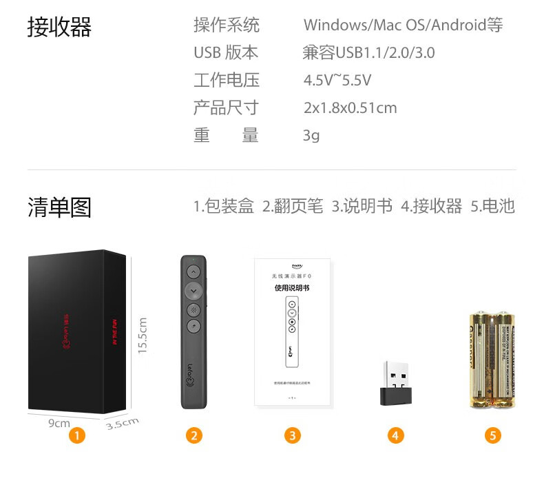 翻页笔*1,接收器*1,电池*2,说明书保修卡合格证*1