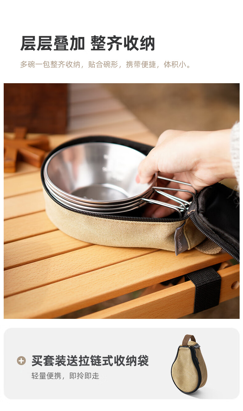 爱加芬 野餐不锈钢304雪拉碗收纳包套装户外折叠碗餐具露营便携广口碗 雪拉碗5件套+收纳袋