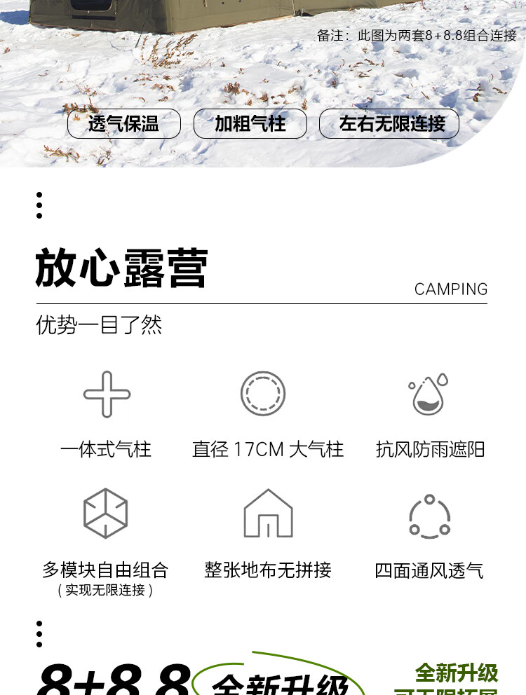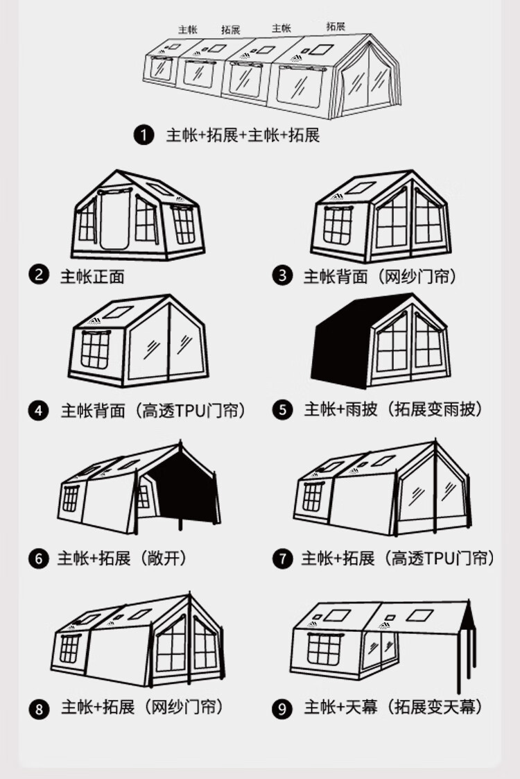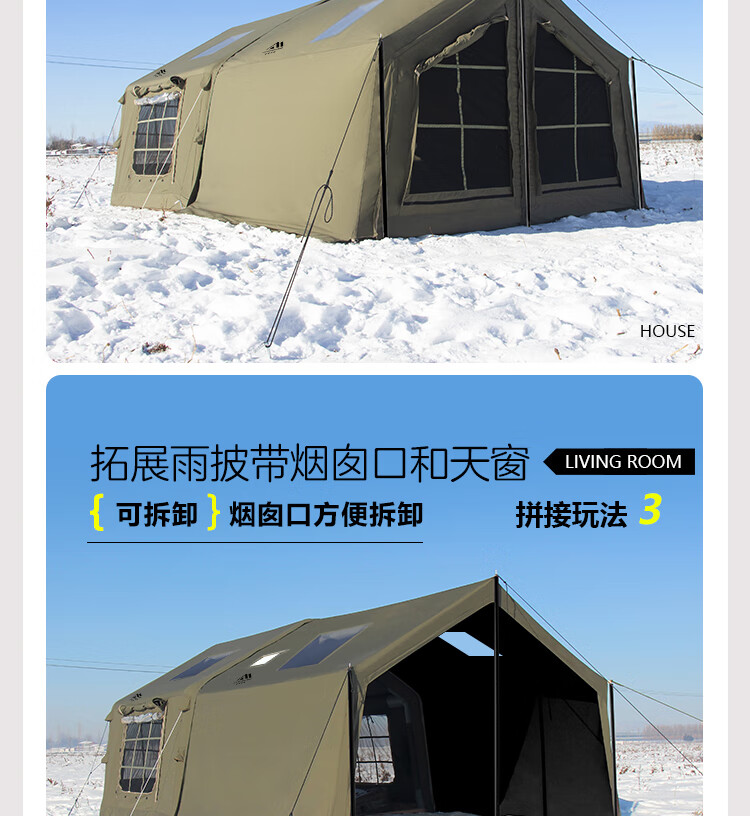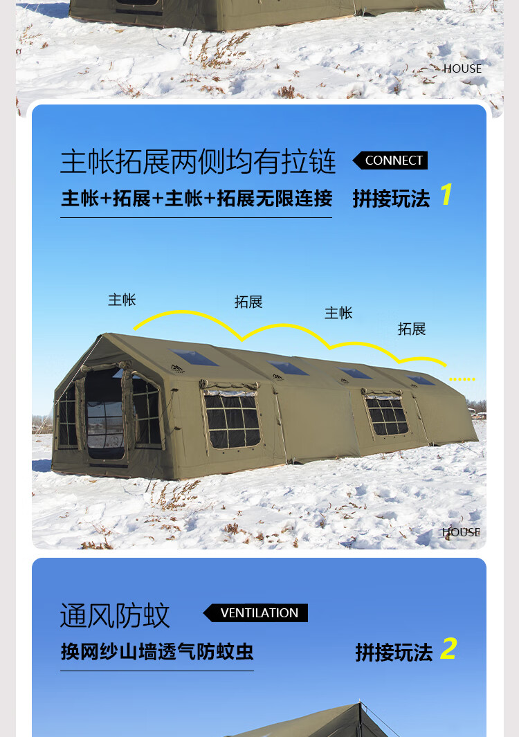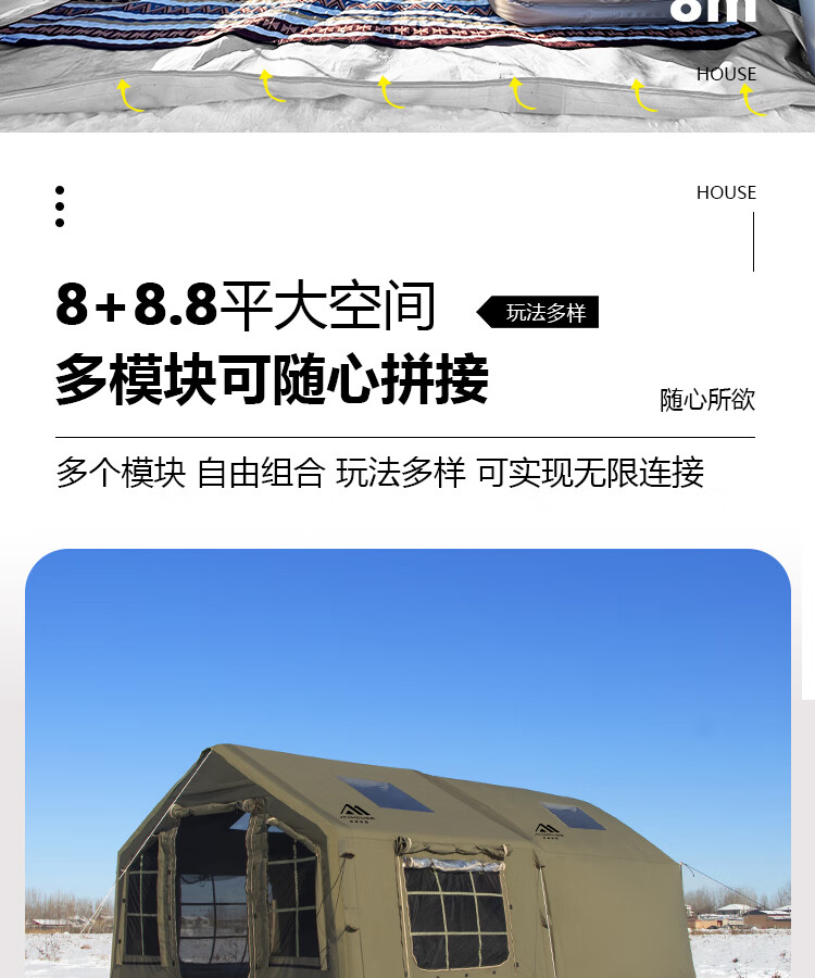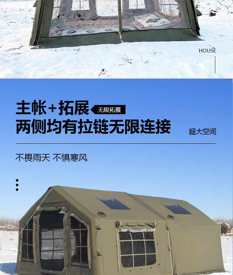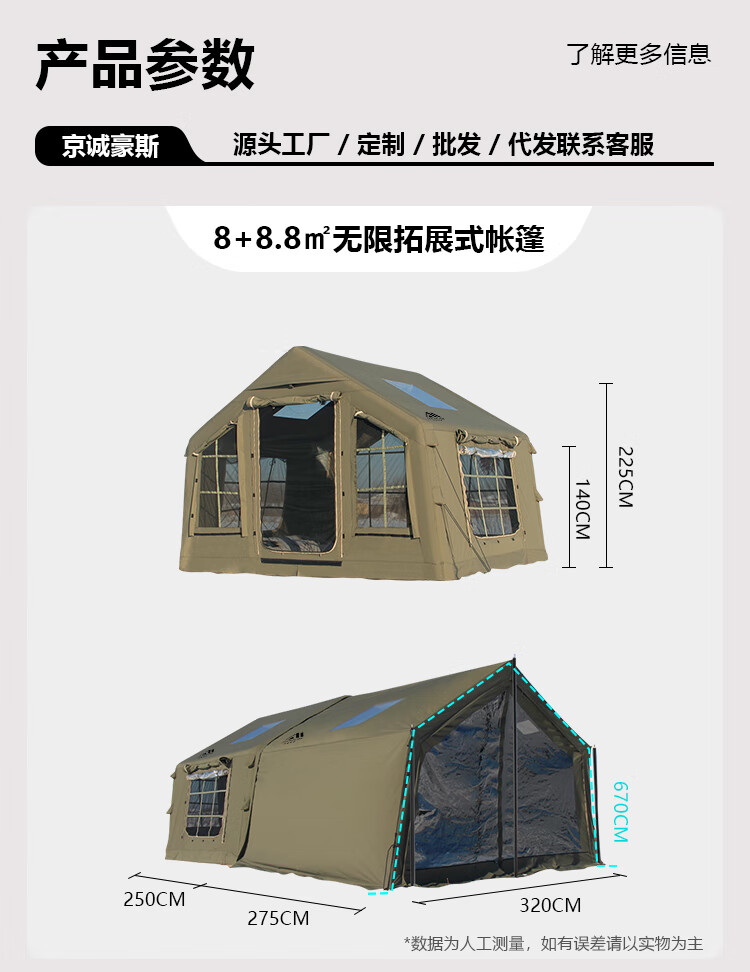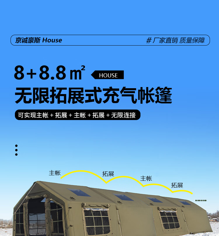 京诚豪斯JcHouse8+8.8㎡充气帐篷拓展式棉布野露营地过夜屋脊帐 军绿8+8.8㎡主帐+拓展气柱