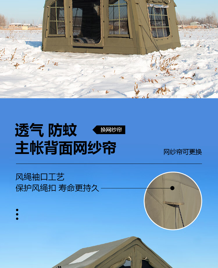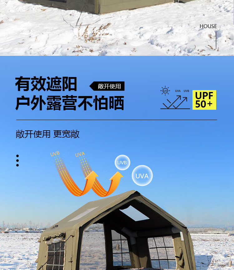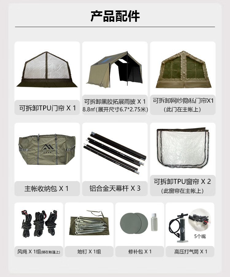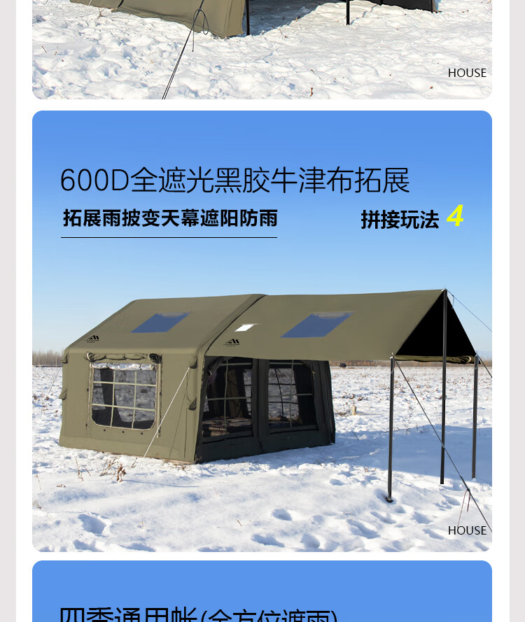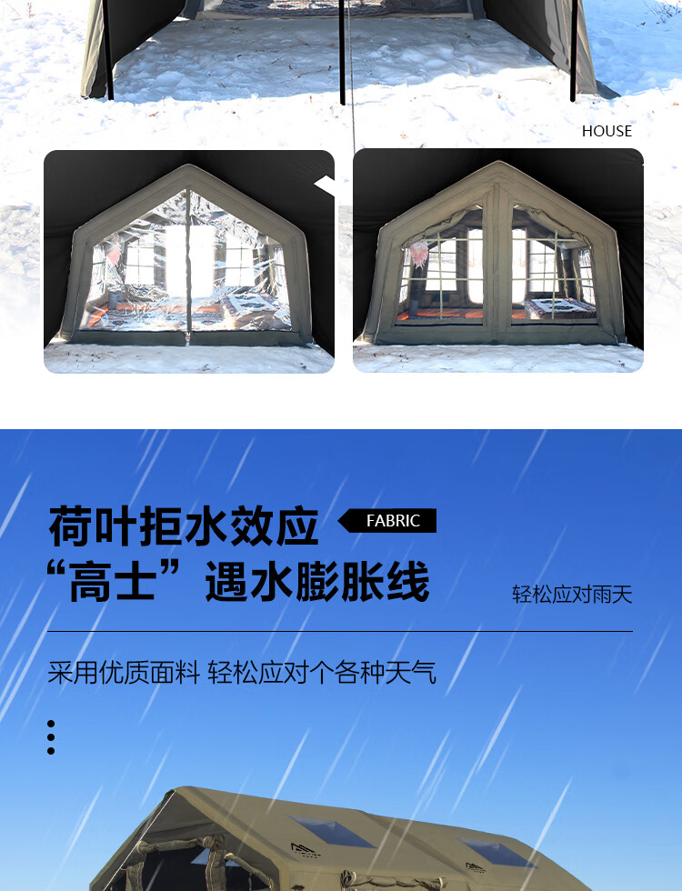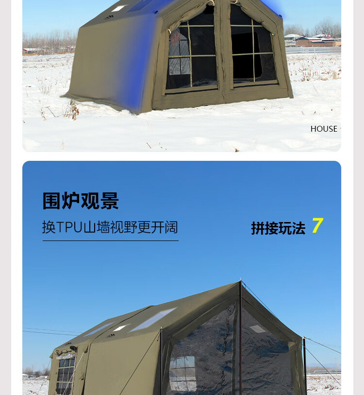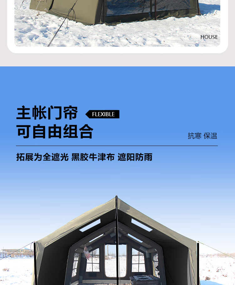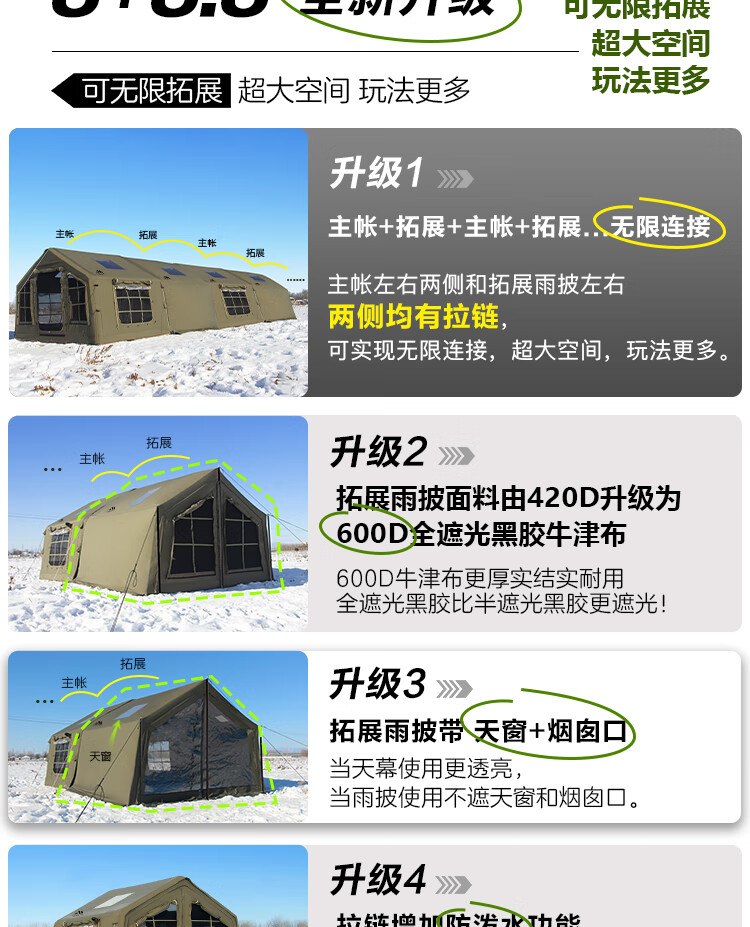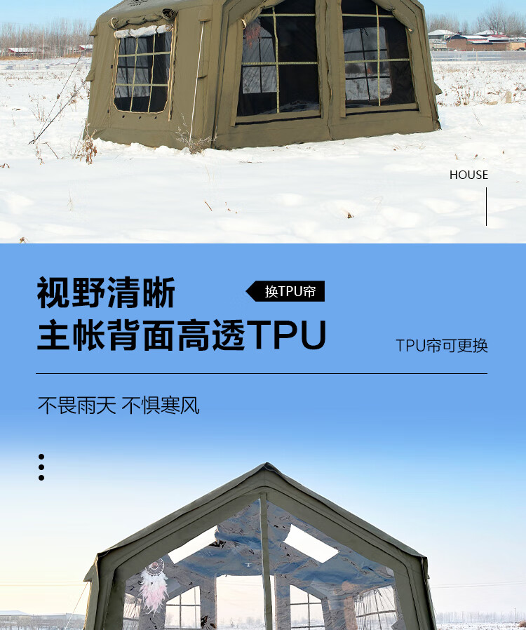 京诚豪斯JcHouse8+8.8㎡充气帐篷拓展式棉布野露营地过夜屋脊帐 军绿8+8.8㎡主帐+拓展气柱