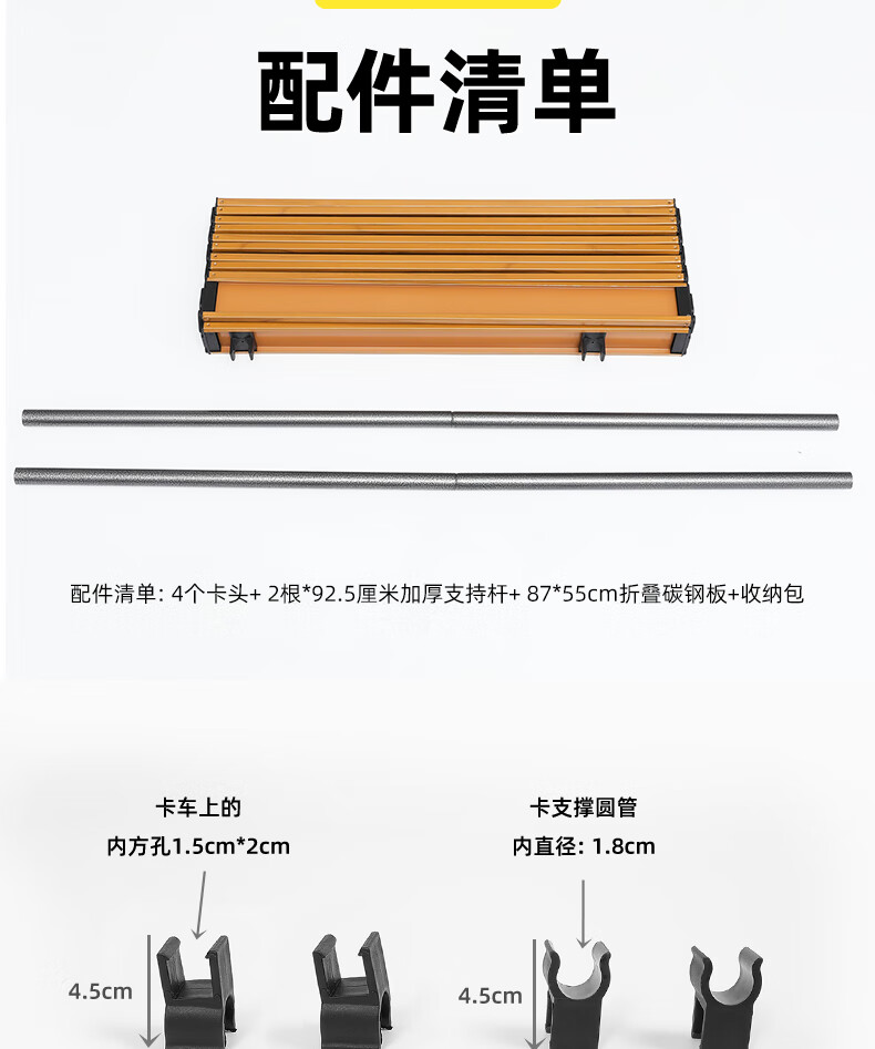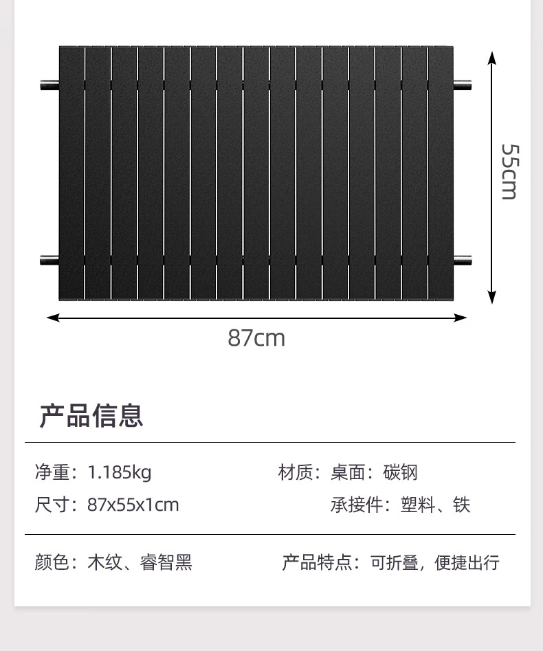 桌板质量挺好的,刚好配家里的露营车尺寸,安装方便,还送了收纳袋,出门带着很方便,黑色耐脏,也好打理,双十一价格优惠,很适合这个季节去露营,