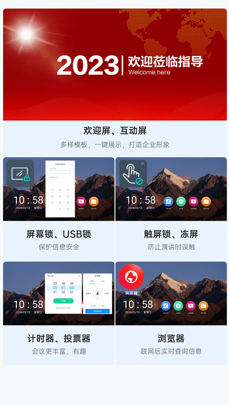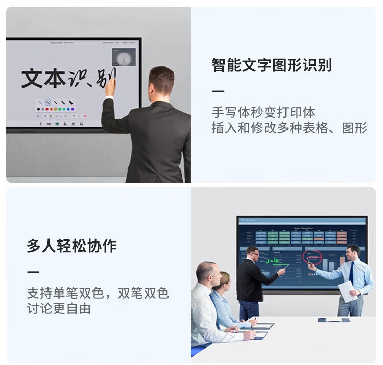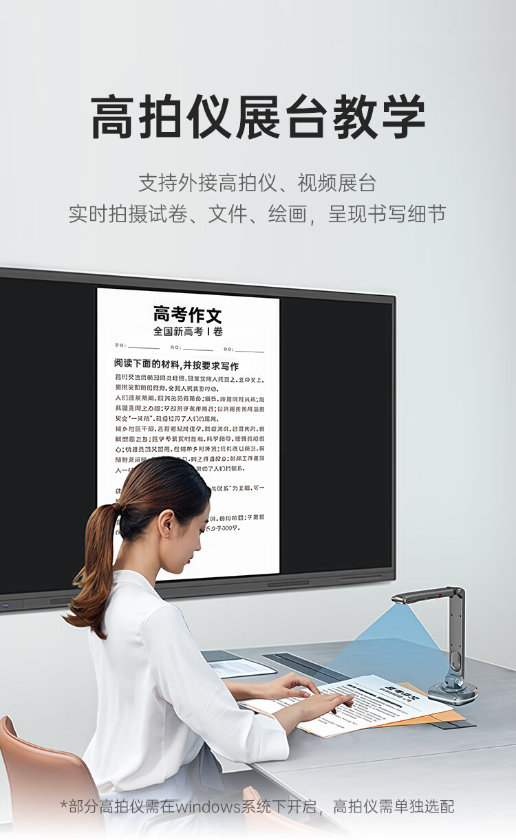 买来不是用在办公室开会,而是放在家里给小孩做视频课程的投屏与学习材料的说明和讲解,非常实用,扫码可以上传,平时还可以看看电视。