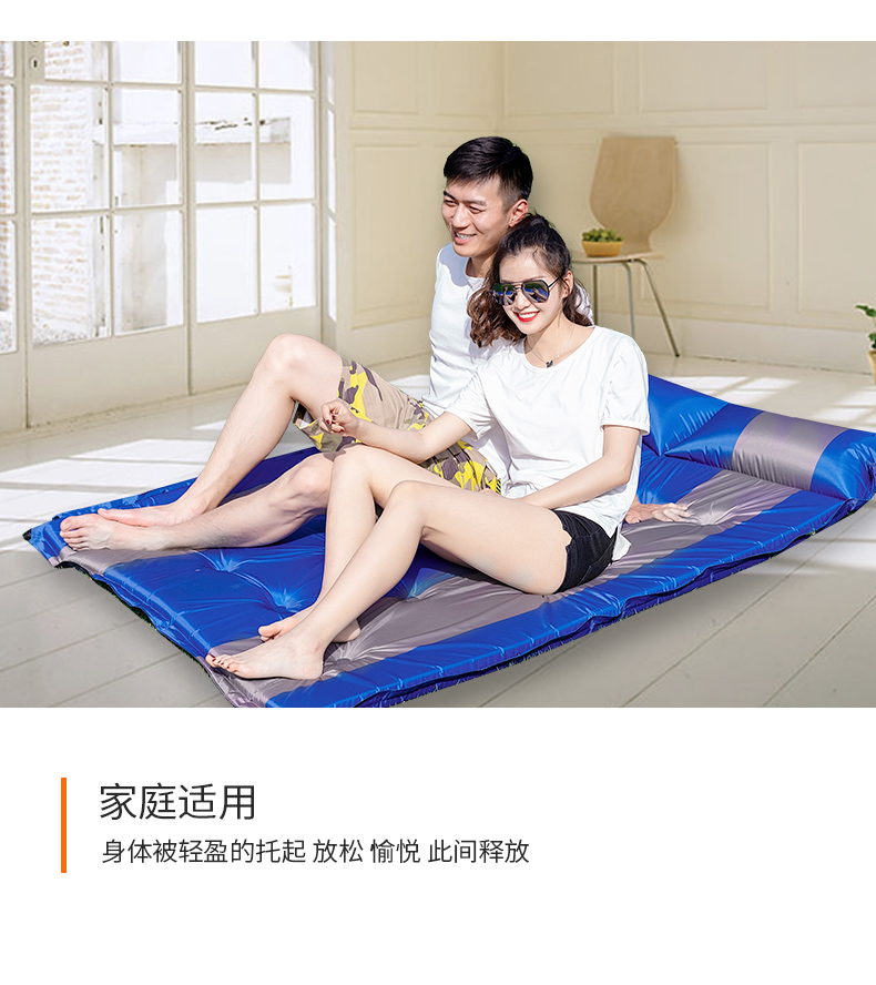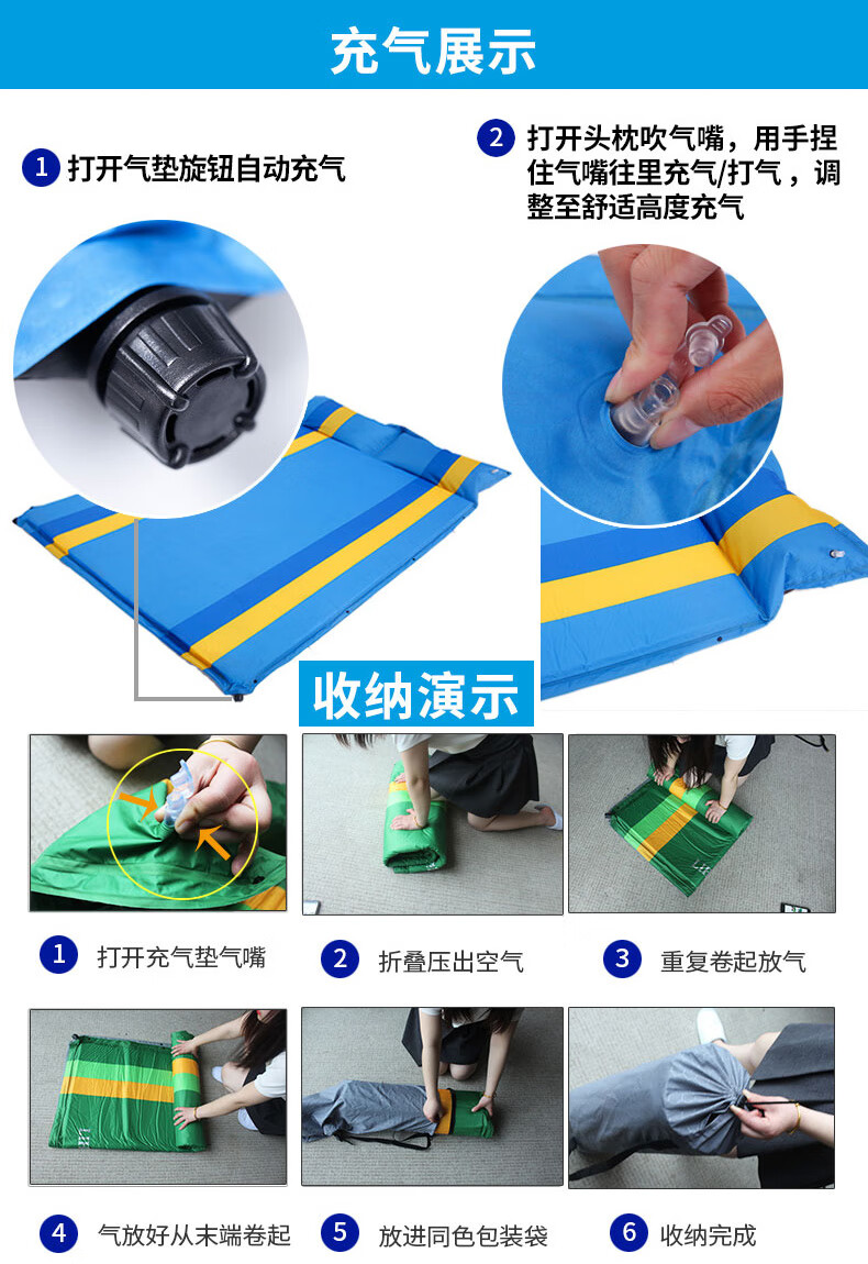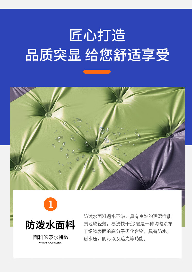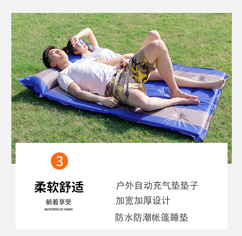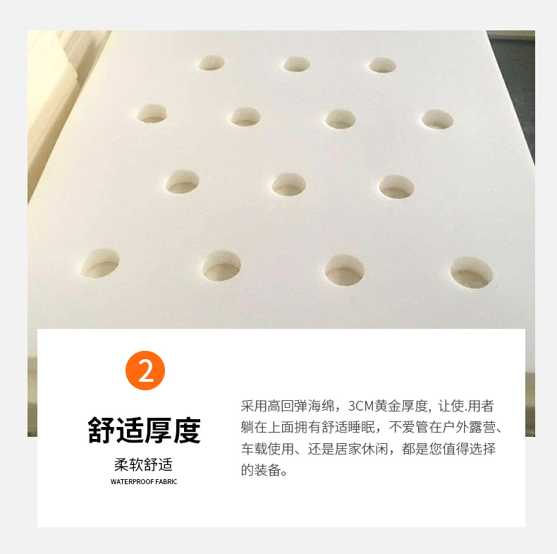 防水效果:还可以,但是气垫感没有那么明显,睡在上面稍微有点薄的感觉 适用场景:在家,在外面,草地上,甚至可以当个餐垫 容纳人数:2个人比较宽裕,买了两个能够拼成一个更大的 透气效果:不太透气
