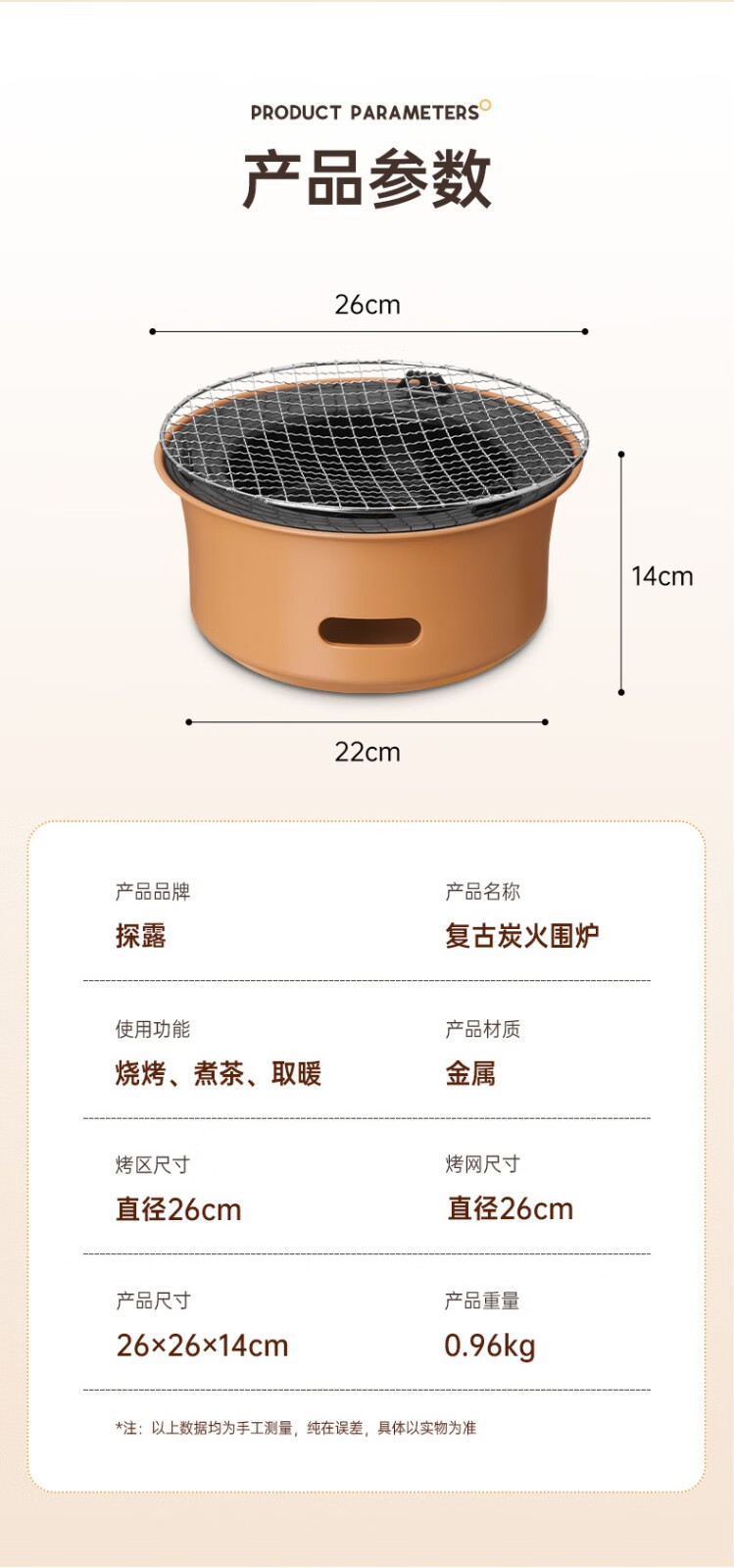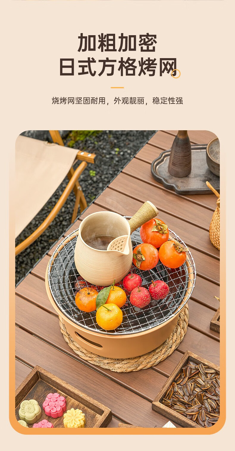 挺好用的,复古的颜色很喜欢,拆卸清洗也很方便,价格也不贵,赞赞赞,很适合喝茶烤东西吃。烧烤网是那种很有质感的,密度可以,不用担心烤的过程食材掉落。暖炉煮茶,烧烤,取暖,多功能的产品绝绝子拉~很好会推荐给朋友再回购的。
