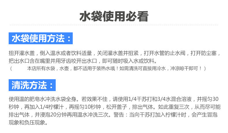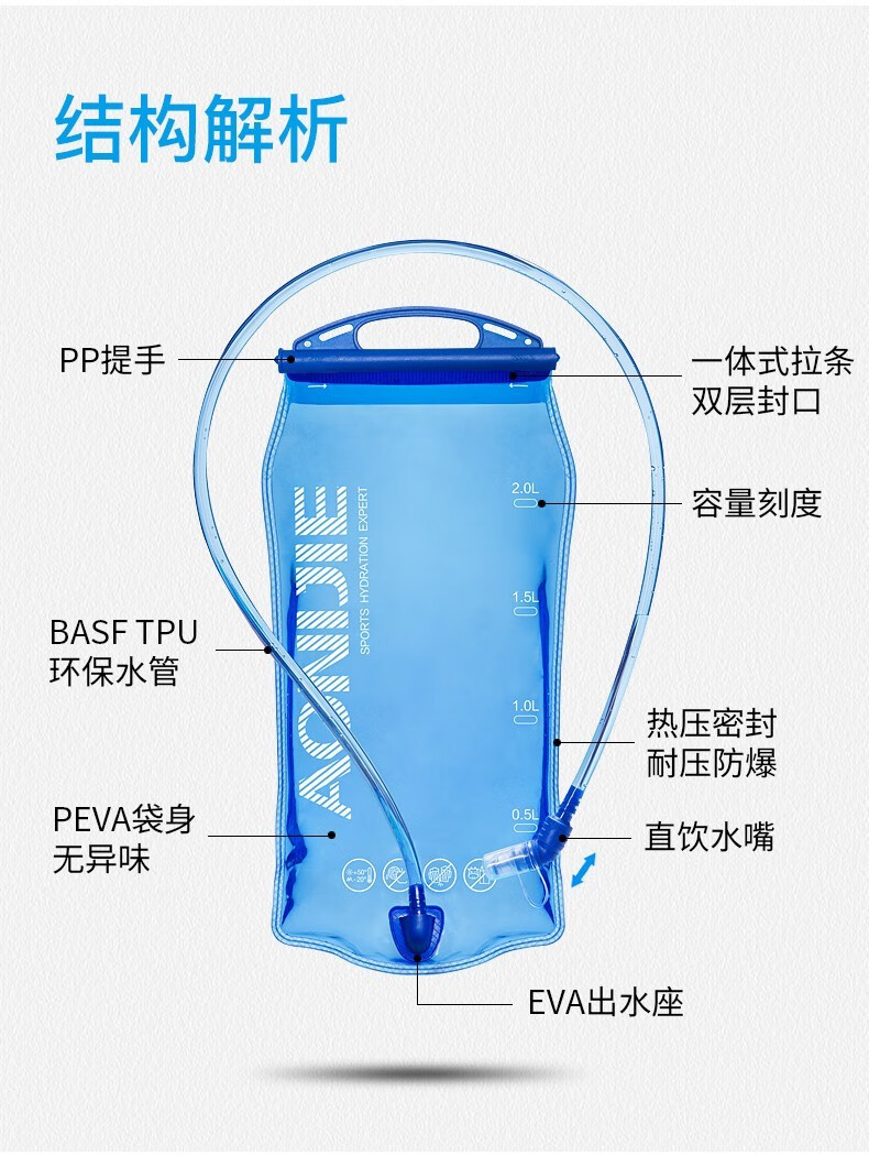 水袋的颜色很好看,容量也非常的大,我买的两升装,足够出去玩一次饮用的量,吸管设计的非常合理,直接一吸就能喝到水了,省去了拿水壶的麻烦,刚收到还没使用,用过后再来评价。