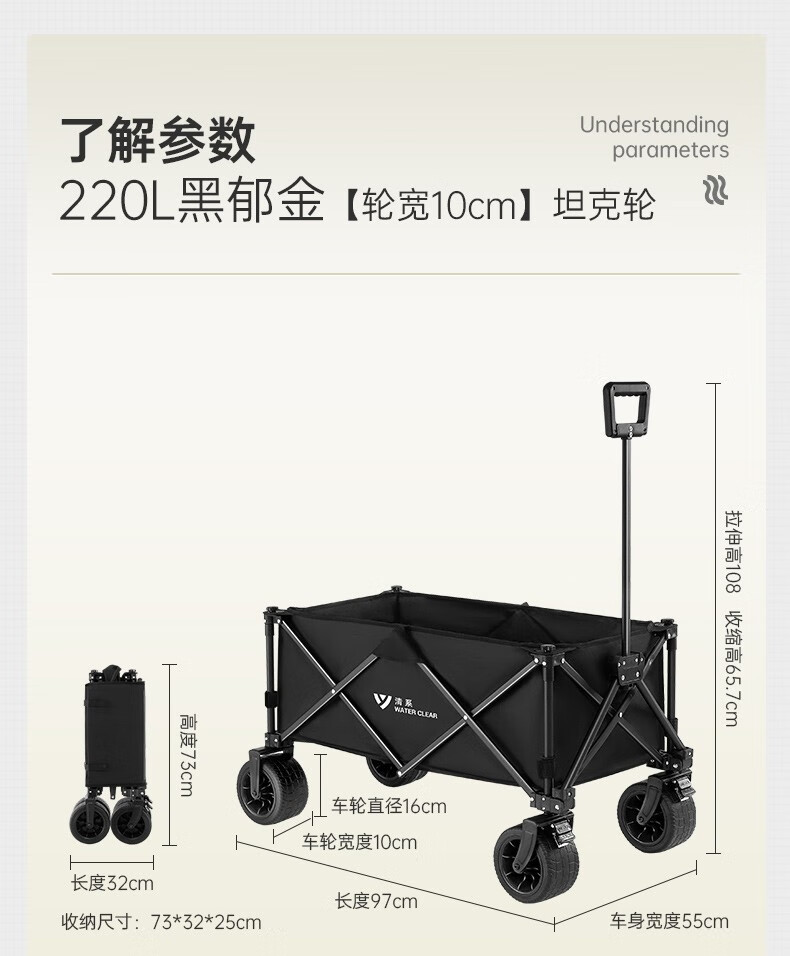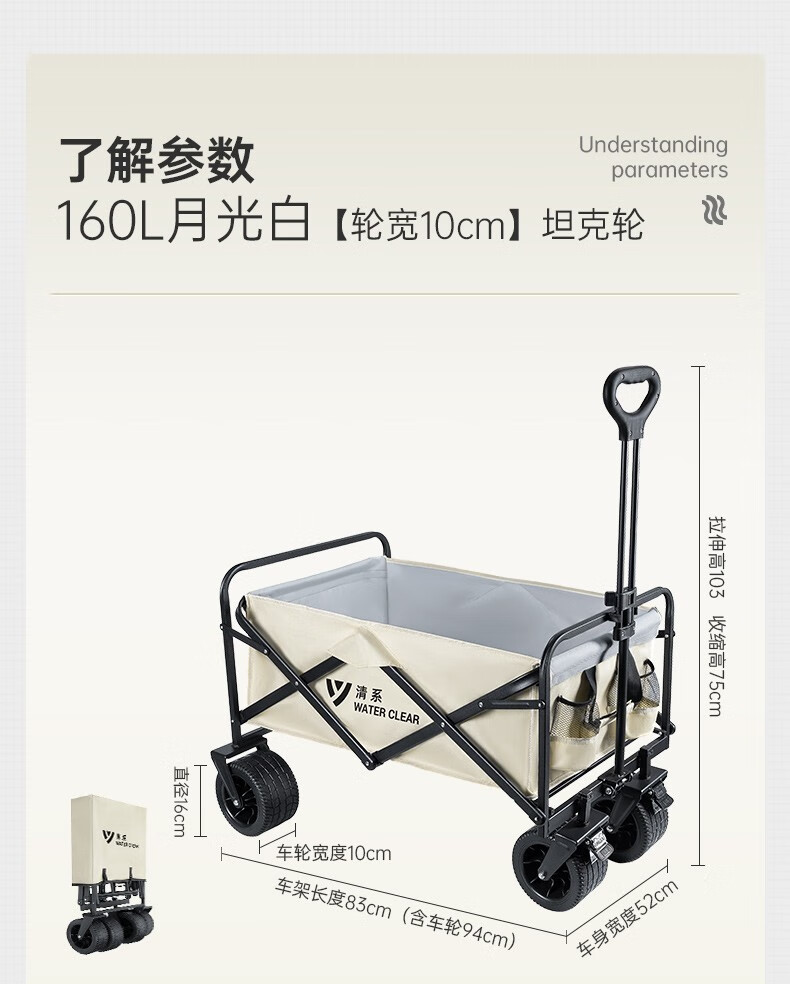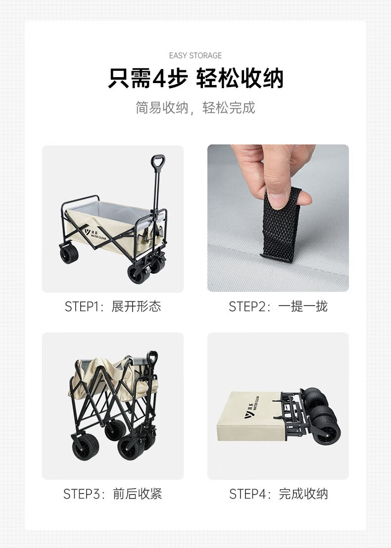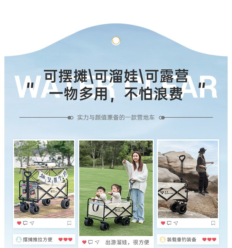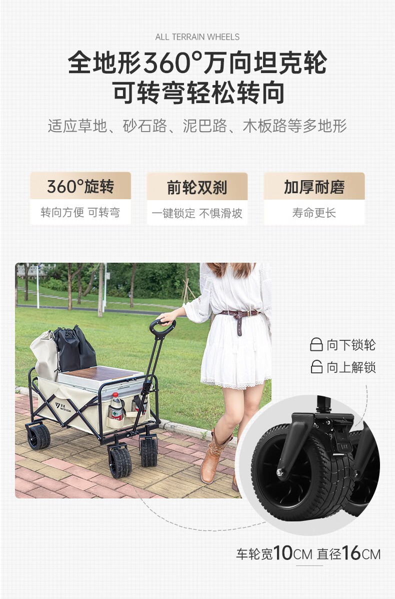 这款露营推车简直是户外全能王!带娃去公园野餐、露营徒步全靠它,超大置物篮能装下帐篷、折叠床和零食,侧边杯架还能放水壶。车轮自带避震功能,过坑洼路面也稳当,宝宝坐在推车上完全不颠簸。收车后体积小巧,塞进后备箱毫无压力,一车解决出行收纳难题,户外达人必备!