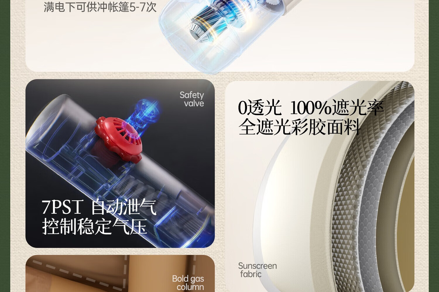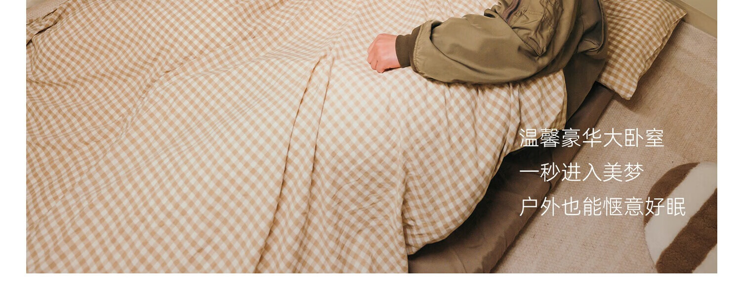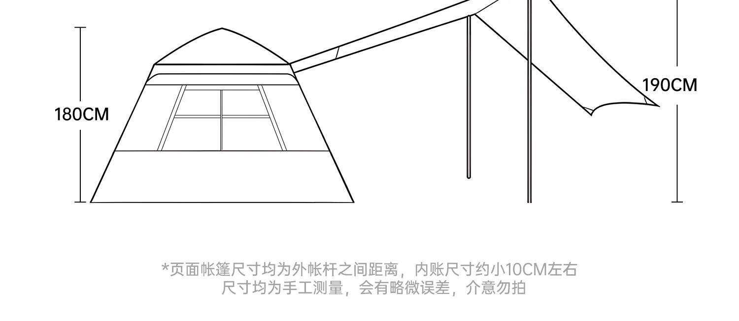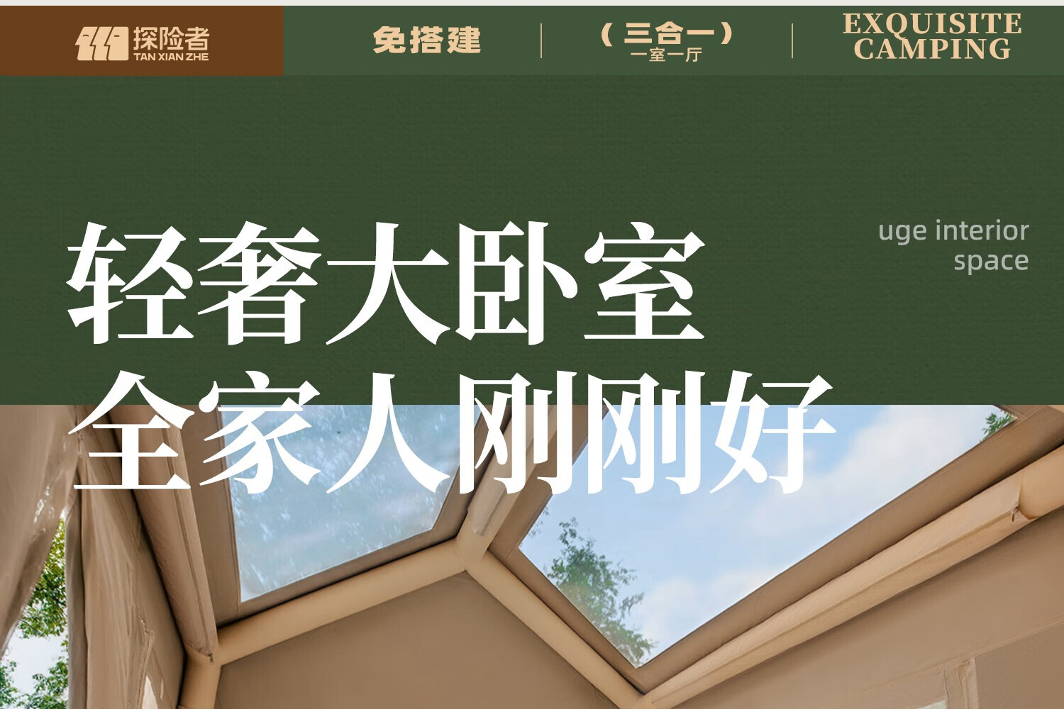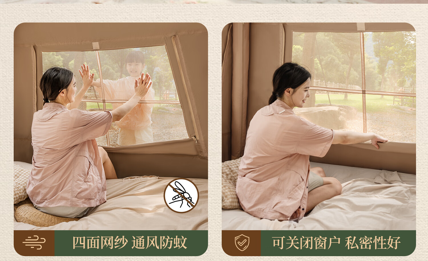 帐篷的设计很满意,在家展开超大够宽,天幕尺寸大家里空间不够,在公园搭建起来简单快速,充气不需要太多步骤,女生也可以独立操作。