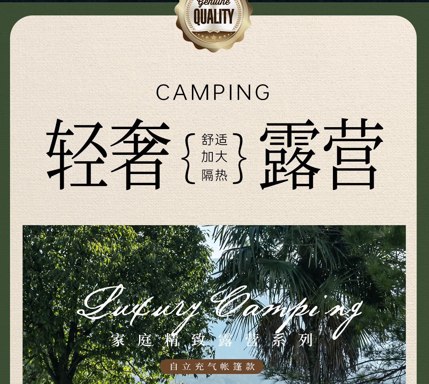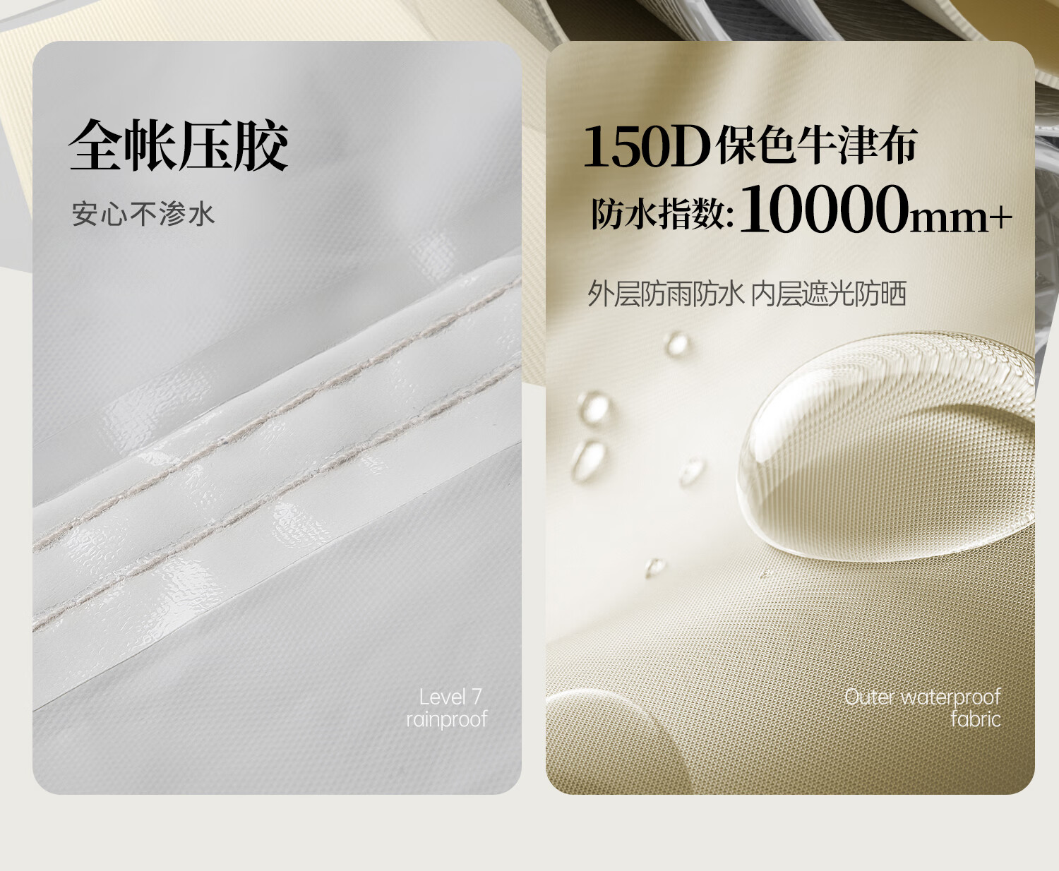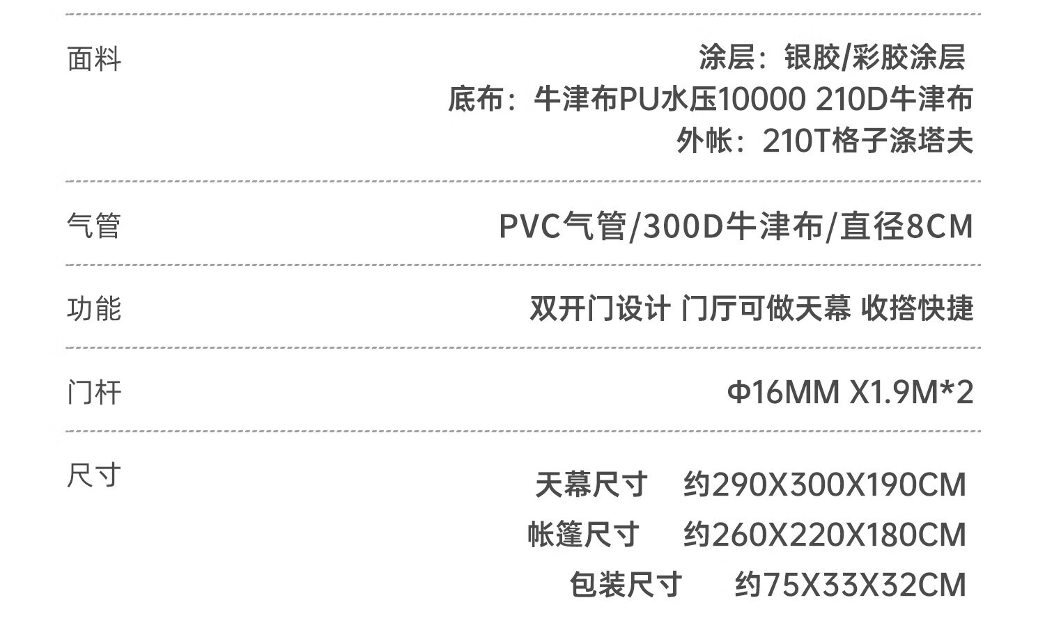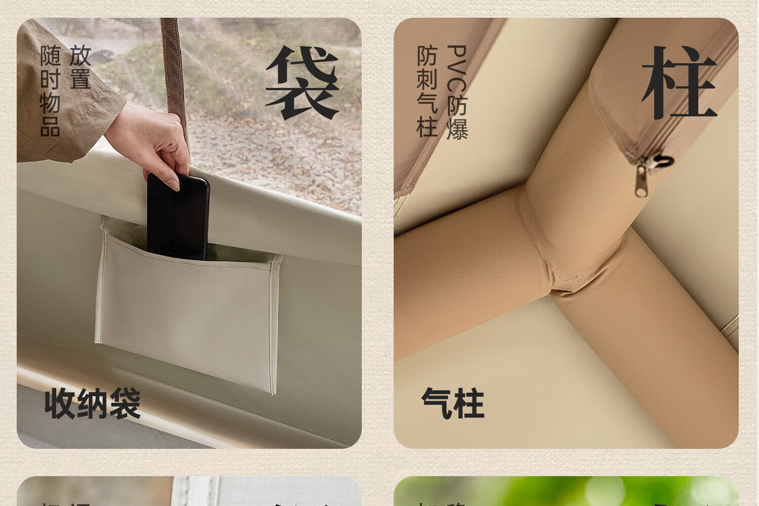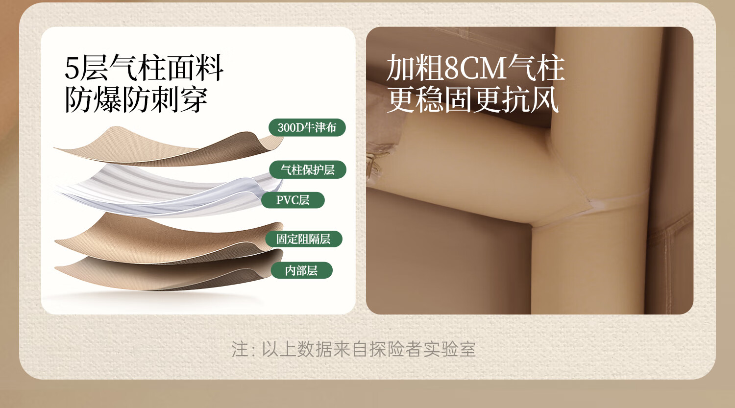 产品不错非常满意,质量做工很🆗,外账做的加厚可以有效防水,缝线没有脱线的现象,空间大通风效果好,充气简单安装方便,防漏气的气柱,💯品牌的就是牛!