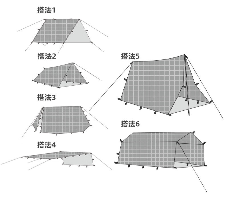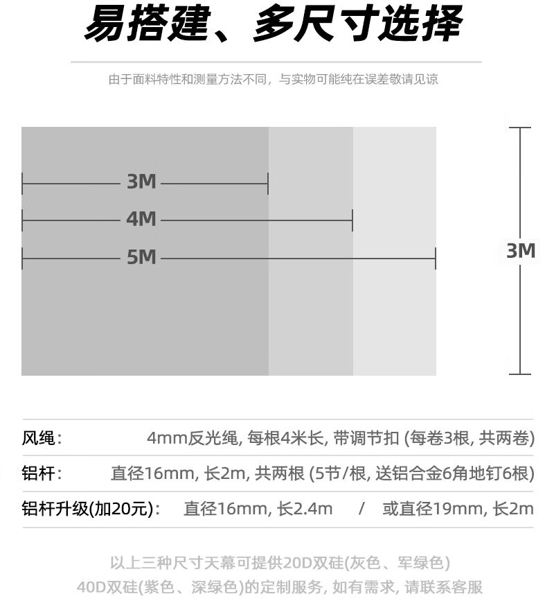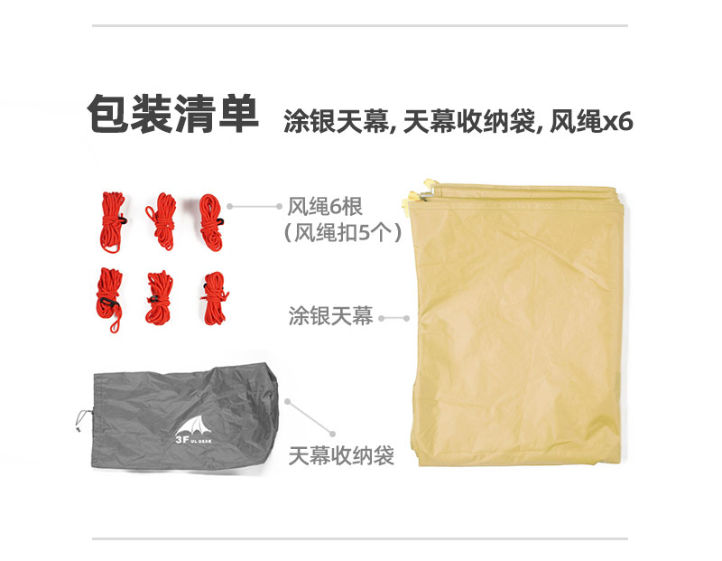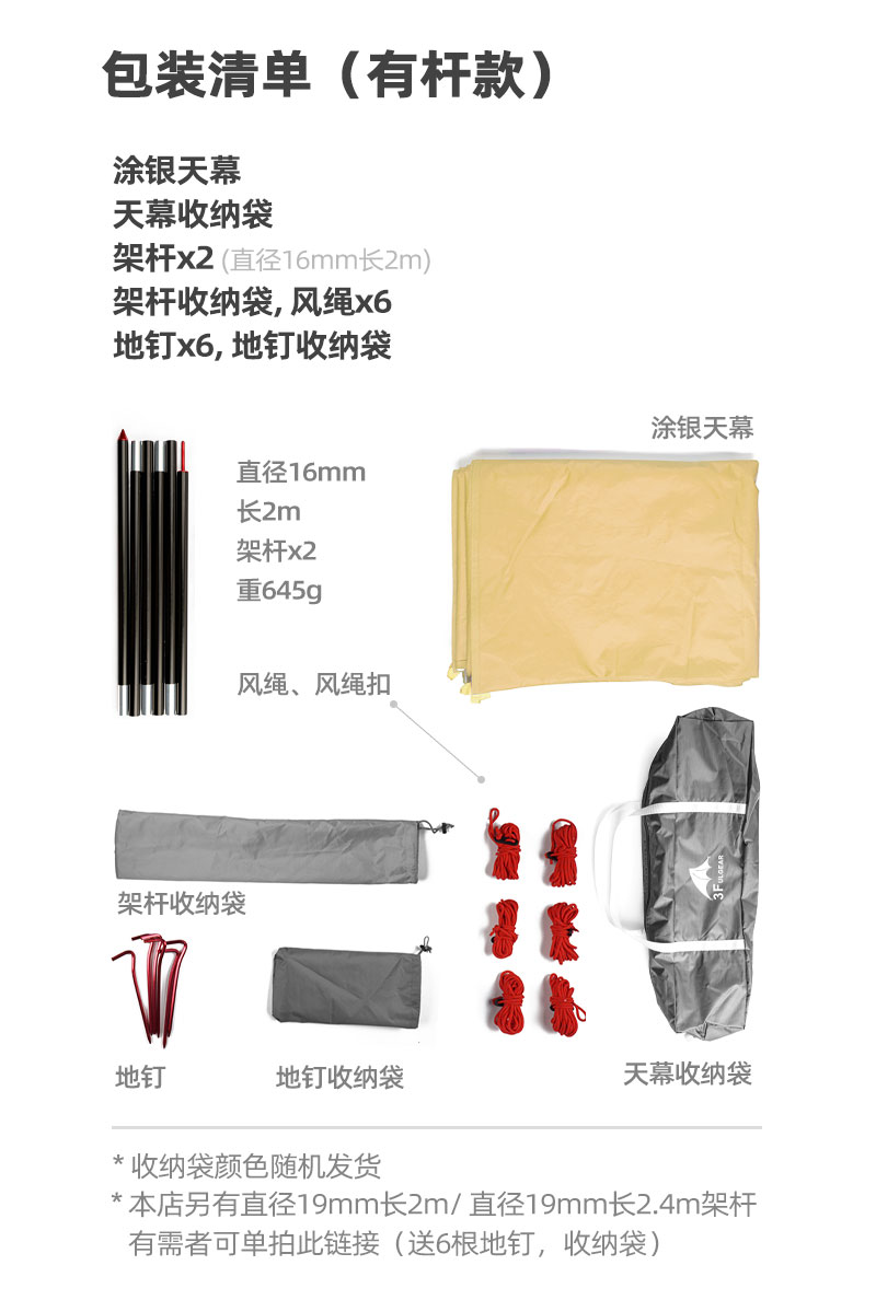 (标配款:天幕*1,天幕收纳袋*1,风绳*6,风绳扣*6) (有杆款:天幕*1,天幕收纳袋*1,风绳*6,风绳扣*6,16mm*2m铝杆*2,地钉*6,架杆收纳袋*1,地钉收纳袋*1)