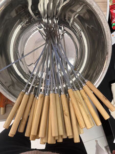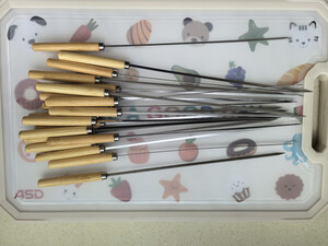 这个烧烤签是不锈钢的材质,不会生锈,也不会变形,还带了木把手。方便串食材和烧烤,买了60根,足够一桌人烧烤了,过年的时候美美的烤了羊肉串,非常巴适。