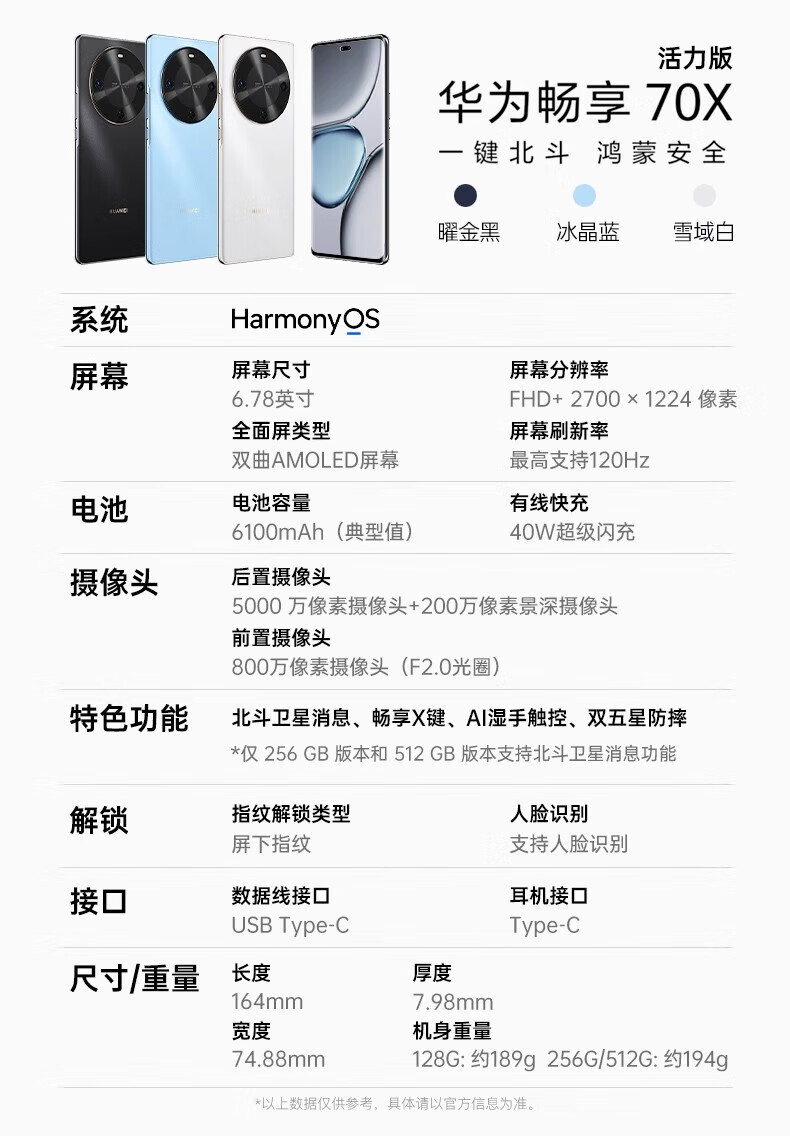 华为畅享 70X 活力版 展样机 一键北斗卫星消息1.5K双曲面护眼屏 手机 正品赠运费险详情咨询客服 冰晶蓝 8GB+256GB