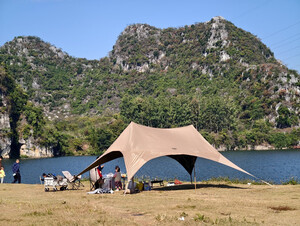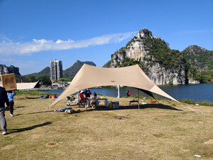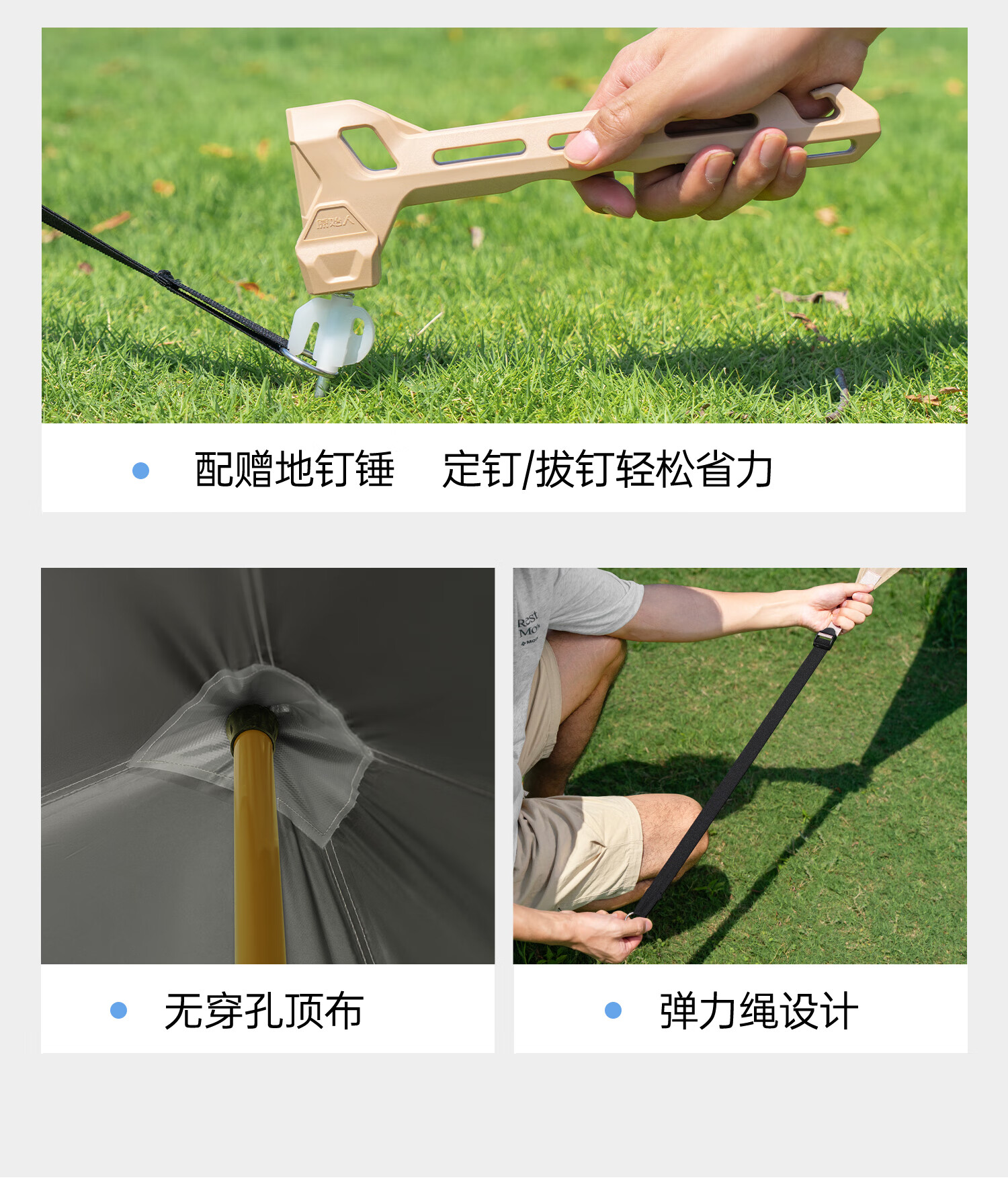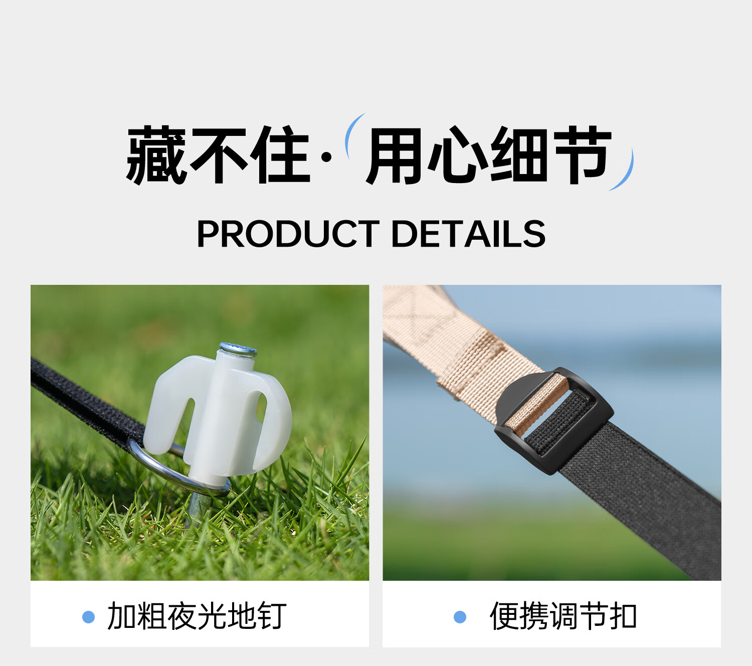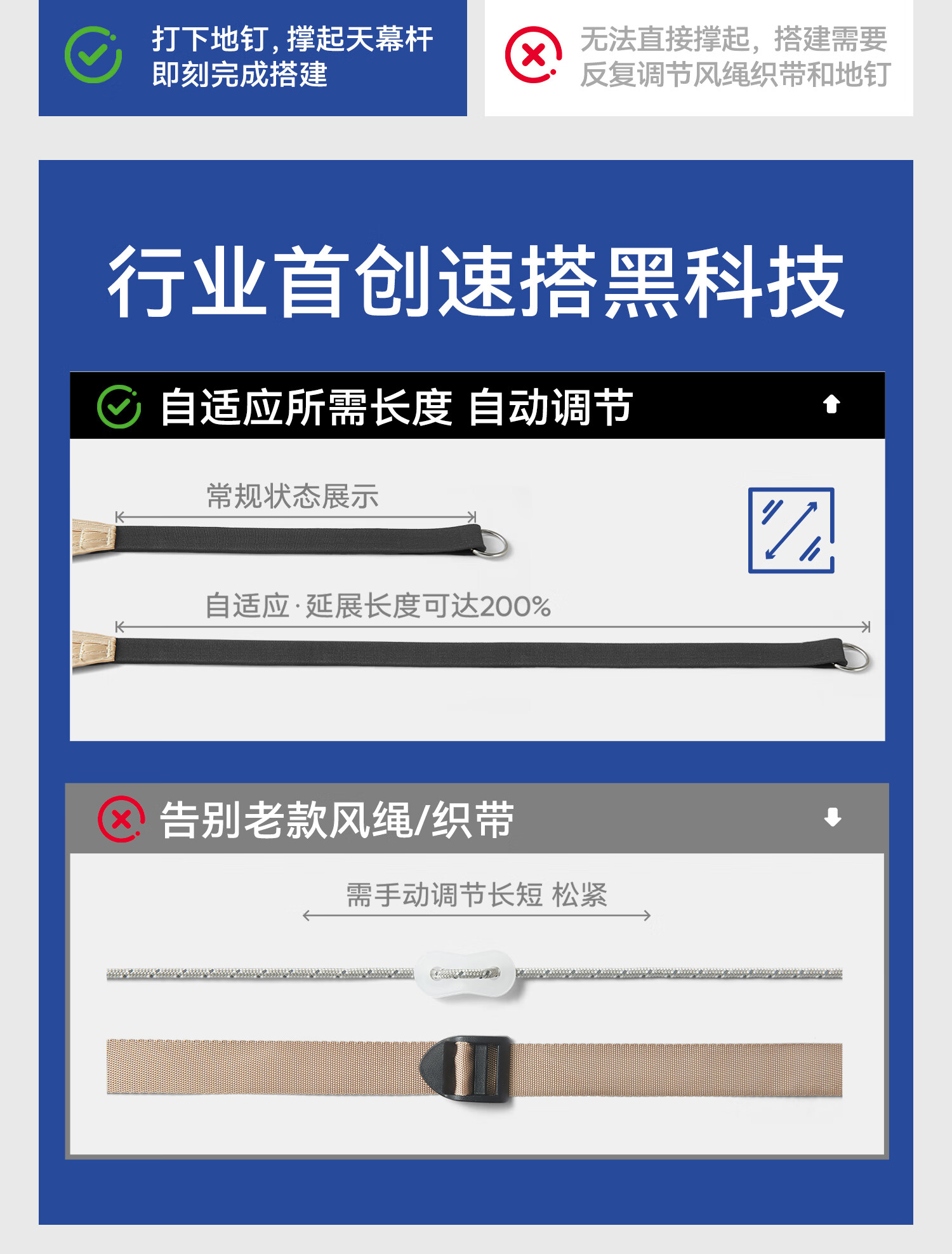对于新手而言还是比较好搭建的,很容易上手,不需要防风绳,天幕也比较大一些还是很可以的,没有防风绳也有点不好的地方是风大了不够稳些。.