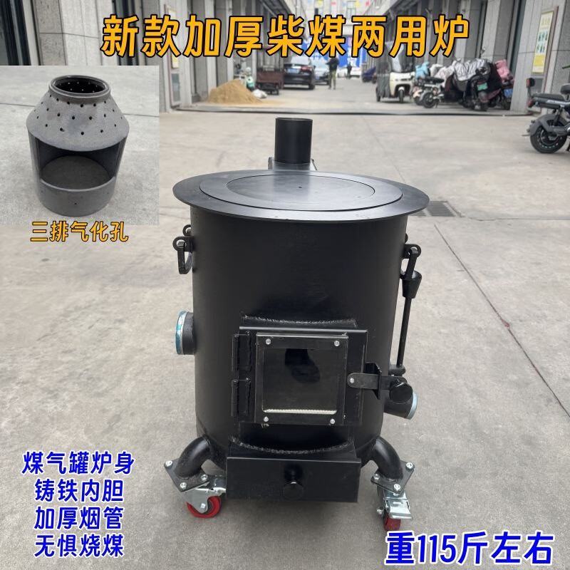 其他家新款烧煤取暖炉煤柴两用整体加厚煤气罐外壳铸铁内胆移动柴火炉 带轮移动款送火勾灰铲火钳 普通炉门