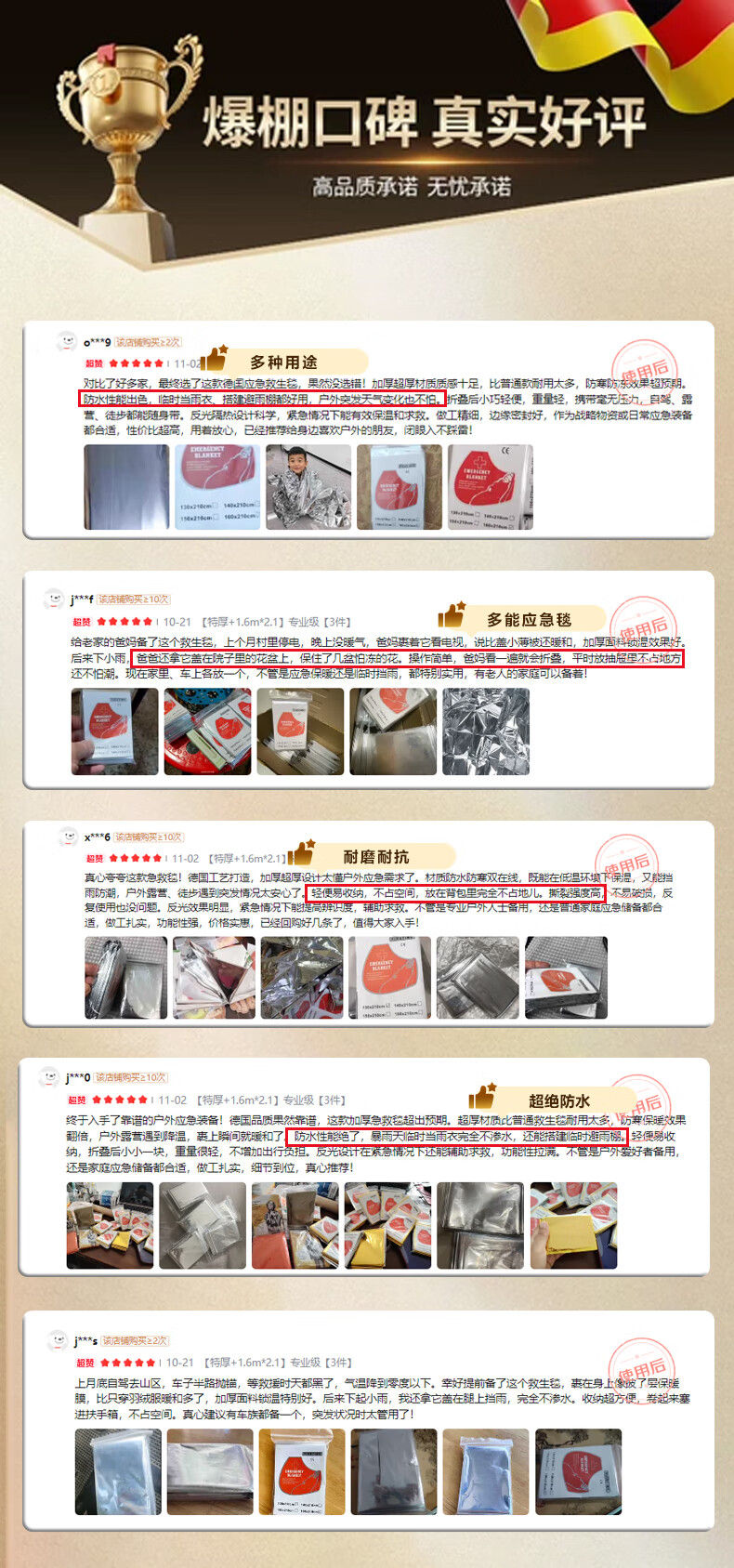 这款德国户外应急救生毯太赞了!加厚超厚材质厚实有韧性,拉扯不变形,耐用性超强。核心功能超给力,防寒防冻效果显著,能快速锁住身体热量,应对户外突发低温完全没问题。同时兼具雨衣功能,防水密封性好,雨天户外也能从容应对。折叠后体积小巧,重量轻,方便随身携带,徒步、登山、自驾都离不开。作为战略物资储备也很合适,关键时刻能救命。做工精细,没有毛刺,边缘处理平整,性价比超高,已经给家人和朋友都备上了,放心又实用!
