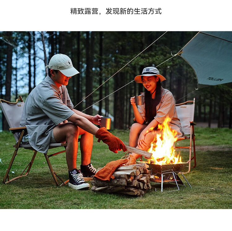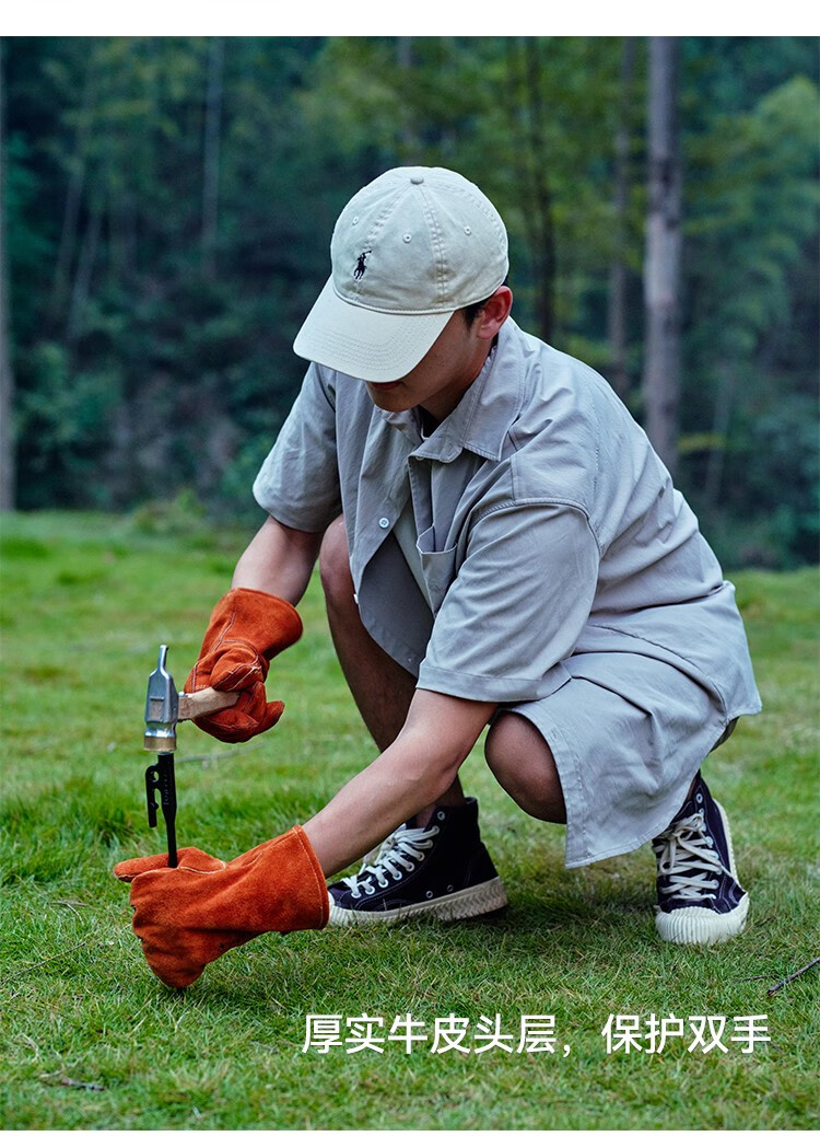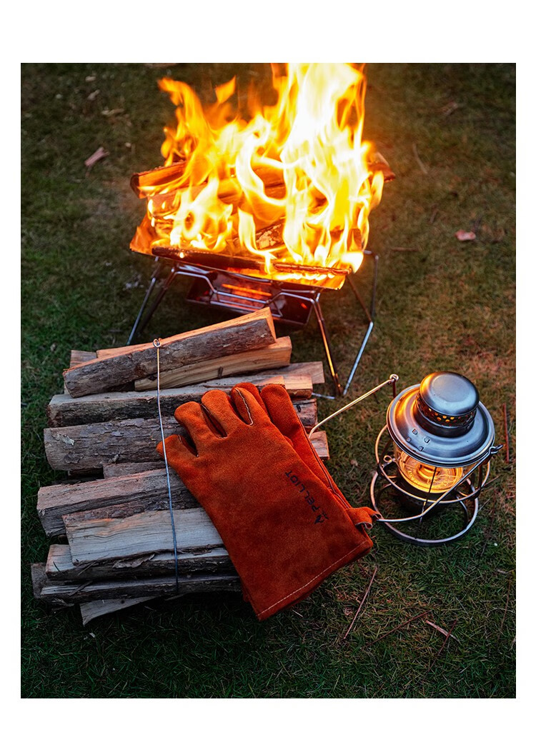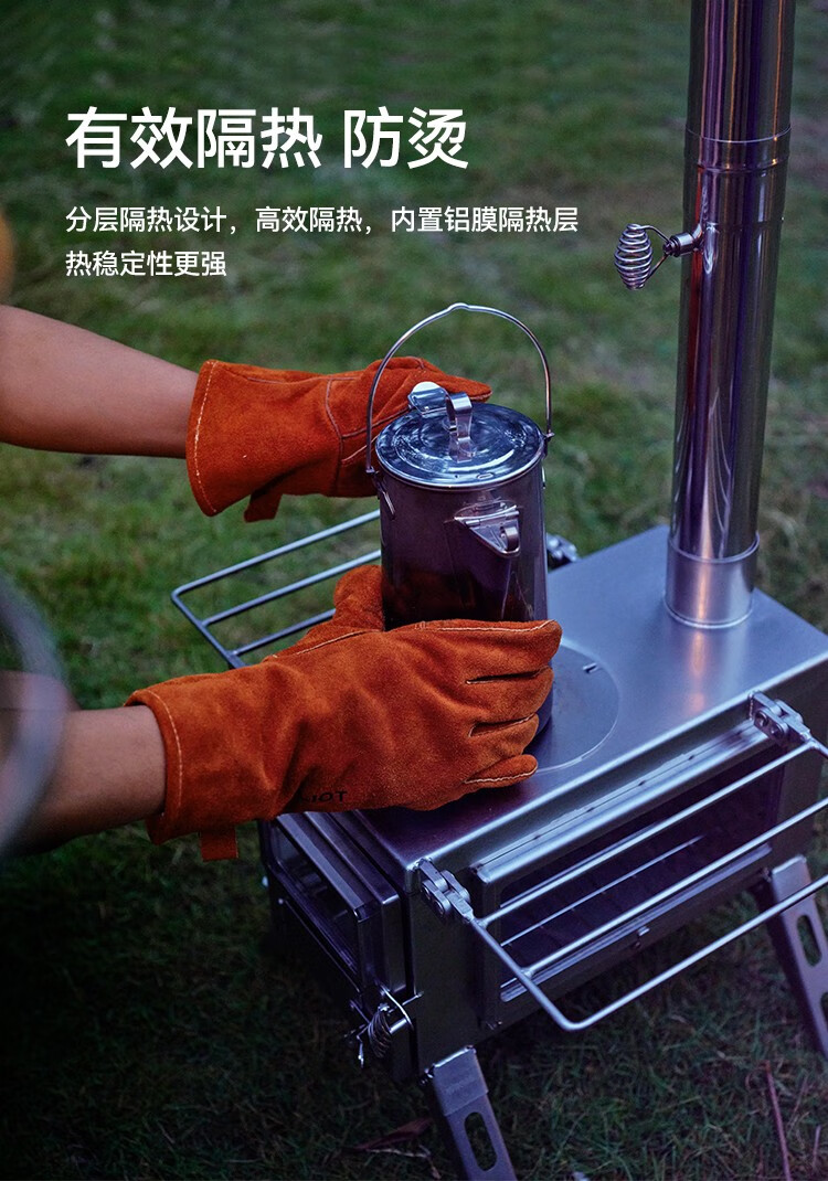牧高笛 露营野餐阻燃隔热手套牛皮耐高温防烫户外野营野炊手套 落叶黄NX23622001长款