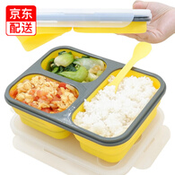 加厚硅胶折叠饭盒收缩便当盒大容量轻便折叠碗带盖叉勺伸缩餐具盒保鲜盒儿童宝多功能可微波野餐餐具旅游用品 黄色三格