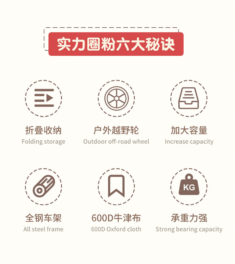 质量好,轮子顺滑推着不费劲,露营装一堆东西都能轻松拖运。折叠起来不占地方,性价比挺划得来。用了好几次都没问题!