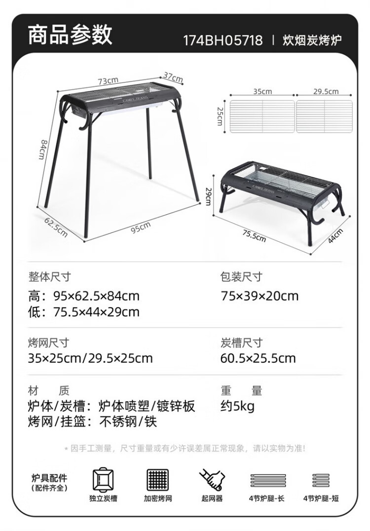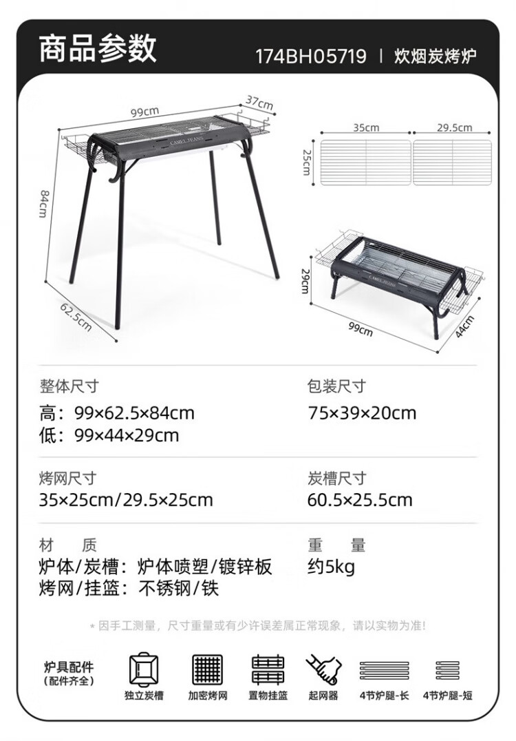 在京东买的最差的产品,没有之一。材质非常粗糙,还容易刮手。铁板用得极差,如图,都弯了。烤肉架不是太稳,不需要考虑长期持有。放碳的铁盘明显尺寸错了,差了将近两寸,如图。价格其实也不算便宜(如果是这样的质量)。本来冲着camel的牌子的,不过这个应该不是camel,只能怪自己太天真。 建议商家下架这个商品。