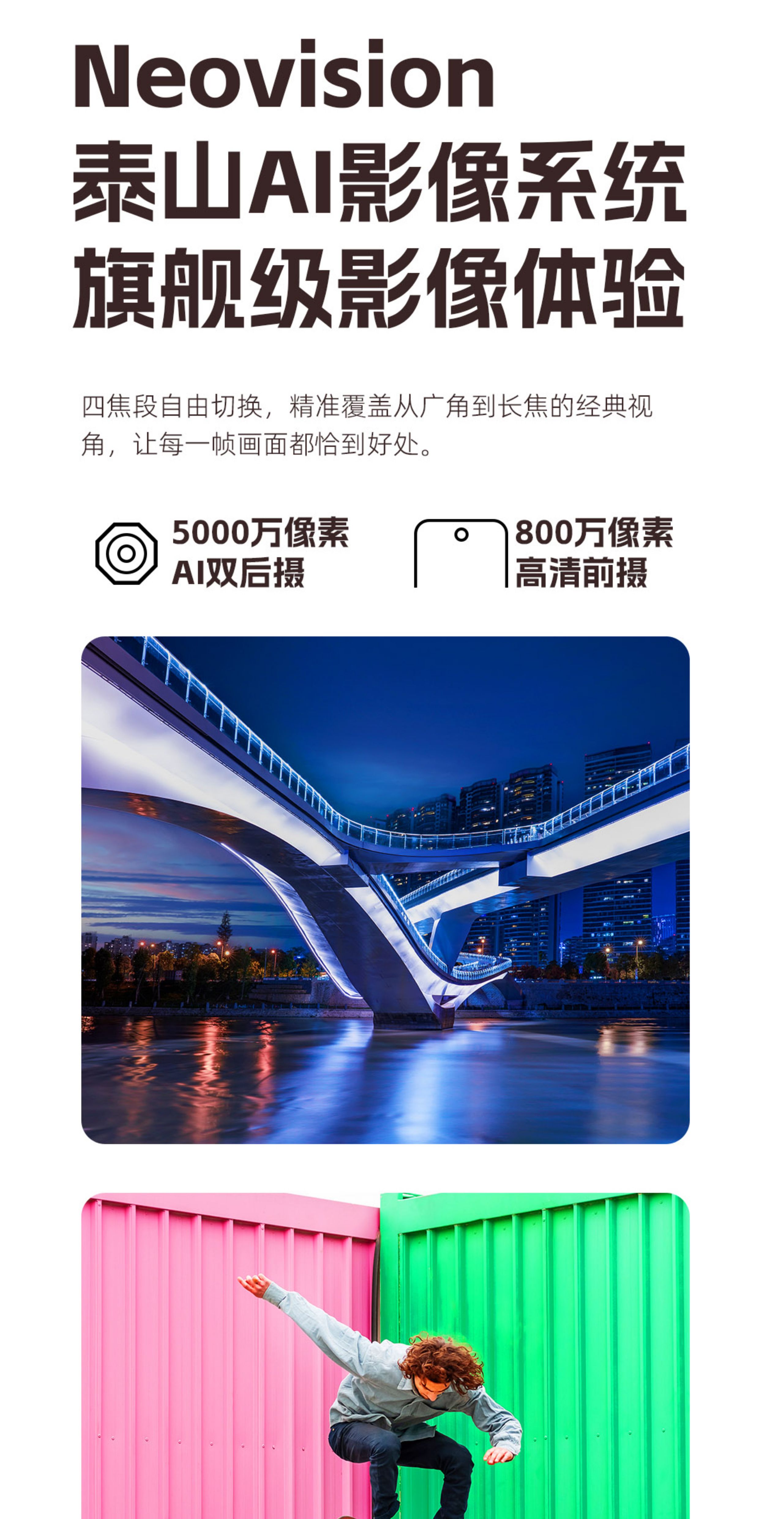 该机外观方面采用旗舰级双面玻璃机身 + 圆形相机模组设计,提供月影灰与青玉绿 2 种配色。新机后置 1300 万像素镜头,支持 AI 闪电抓拍、3DLUT 专业引擎、海报水印等功能;正面配备一块 6.56 英寸 120Hz 高刷屏(具体分辨率未公布)。
