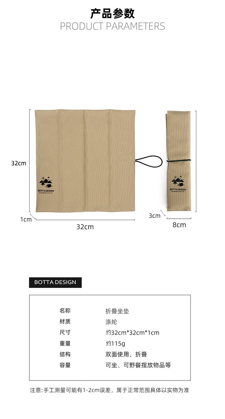 博泰Botta创意户外折叠坐垫,产品采用京东物流,隔日到底。这款户外防潮折叠坐垫的材质是涤纶。 便携性能:产品折叠后呈竖条状,方便携带。