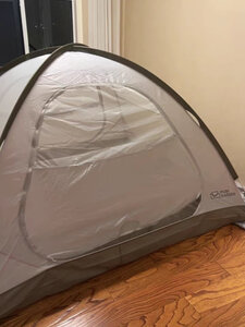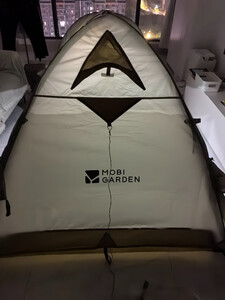 帐篷非常的小巧和轻便,拿来就迫不及待的在家里搭起来。搭建上手容易,卡扣式的用起来非常方便,透风性能好,两侧都有窗口可开放,外面还有一套防雨防风罩。背在旅行包里就可以上山,真好。商家还赠送了一个野餐垫。