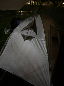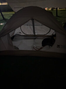 终于用上啦,傻瓜式搭法,搭起来特别简单,两个人十分钟就搞定,只要拉伸到尾基本不用怕下雨了,两人款两个成人+一只小狗都能睡,通风透气都还不错。
