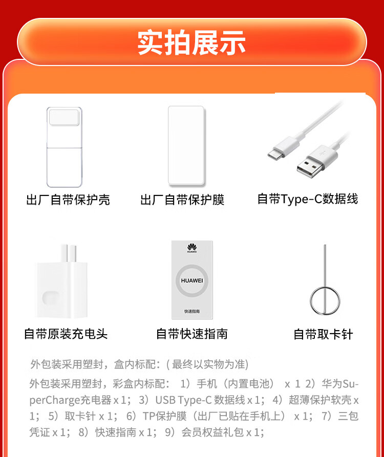 手机(内置电池)×1; 2、华为 SuperCharge 充电器 66W×1; 3、Type-C 数据线×1; 4、保护膜(出厂已贴在手机上)×1; 5、快速指南×1; 6、取卡针×1 7PC保护壳