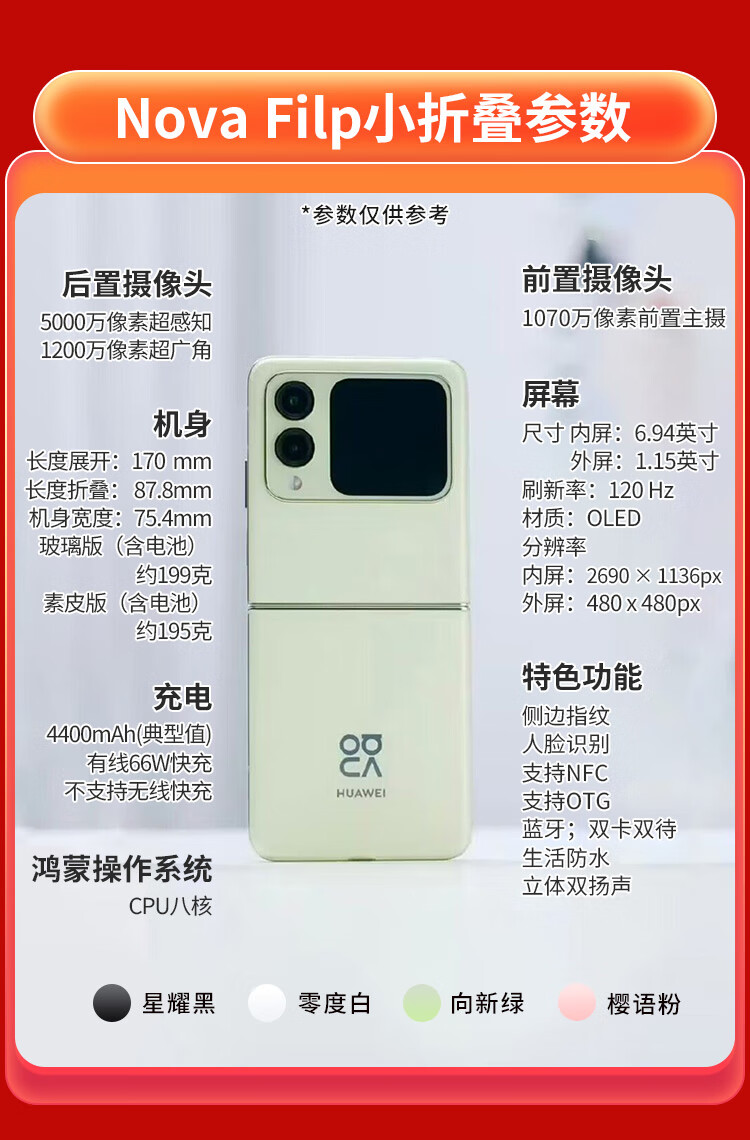 华为折叠屏手机novaFlip新机原装正品【24期|免息】新品小折叠后置5000万悬停自拍智能小手机 向新绿 12G+256G 【24期|免息】