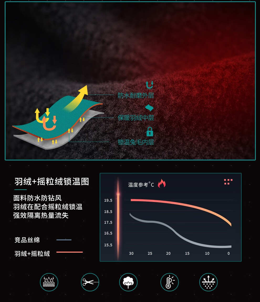 采用羽绒填充,配合加绒内里设计,能够在寒冷天气提供有效保暖 具备防水防滑特性,外层采用防水面料,适合骑车、滑雪等户外活动 男女同款,均码适配