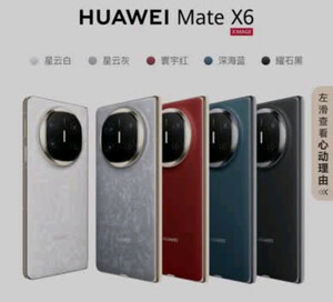 华为Mate X6是华为在双折叠屏手机领域持续研发创新的最新成果,打破传统折叠屏手机的固有框架,打造出的折叠机最强完全体。以下是该款手机的卖点信息: - 外观:以行星运行轨道为灵感,采用Mate系列中轴对称的经典设计理念,是业界领先的轻薄可靠四曲折叠机,通过创新材料的应用和架构设计,赋予手机轻薄且坚固的机身。 - 结构:采用玄武水滴铰链,通过对转轴的机械结构调校,完成了对折叠态厚度瓶颈的突破。核心部件使用超强火箭钢,材料强度大幅提升。 - 屏幕:搭载华为临境显示技术,配备6.45英寸OLED外屏,分辨率2440×1080,打造了内外高清晰、高保真的显示效果。采用第二代玄武钢化昆仑玻璃外屏,耐用性强。内屏采用复合叠层结构设计,屏幕支撑层采用的创新碳纤维材料,抗形变能力强。 - 影像:突破性采用多光谱通道摄像头,配备红枫原色摄像头,色彩还原度高。是业界第一款支持5cm长焦微距的折叠屏手机,长焦镜头拥有4800万像素,F3.0光圈和4倍潜望式光学变焦,能随时随地拍出大片。还能通过AI特效实现不同的创意玩法。 - 通信:应用第二代灵犀通信,即使是在高铁、车库、隧道等弱信号场景,也能保持稳定的